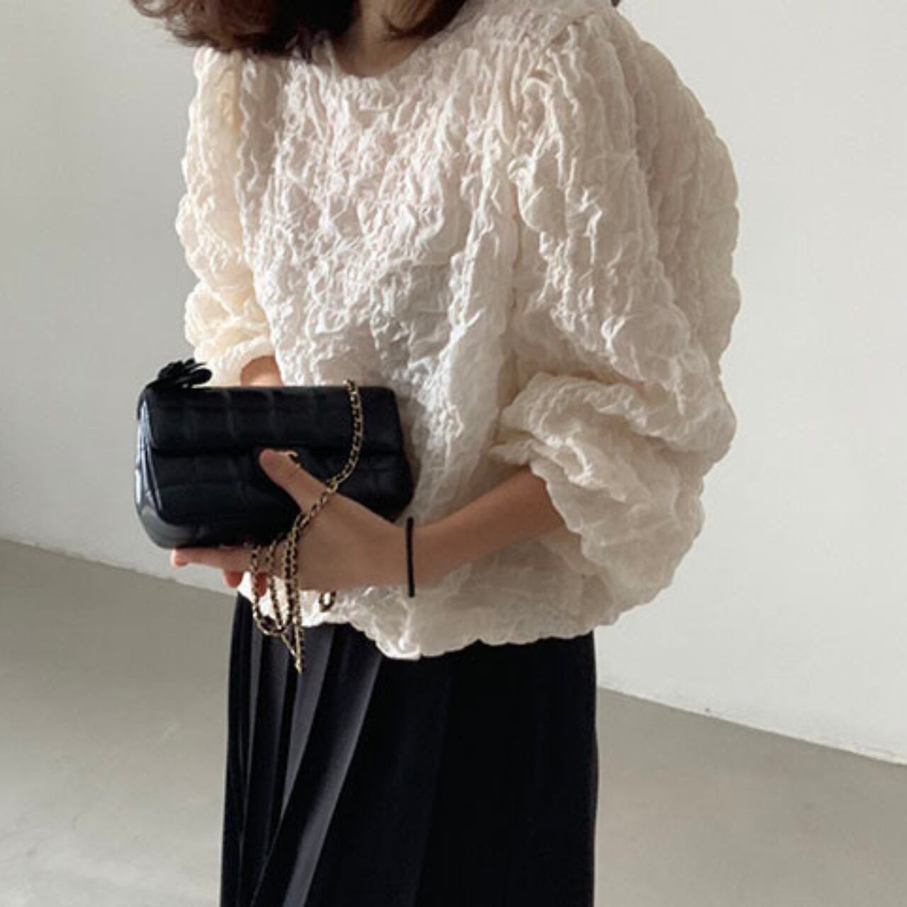 独特のテクスチャーとロマンティックなボリューム袖シルエットが魅力的なブラウス。