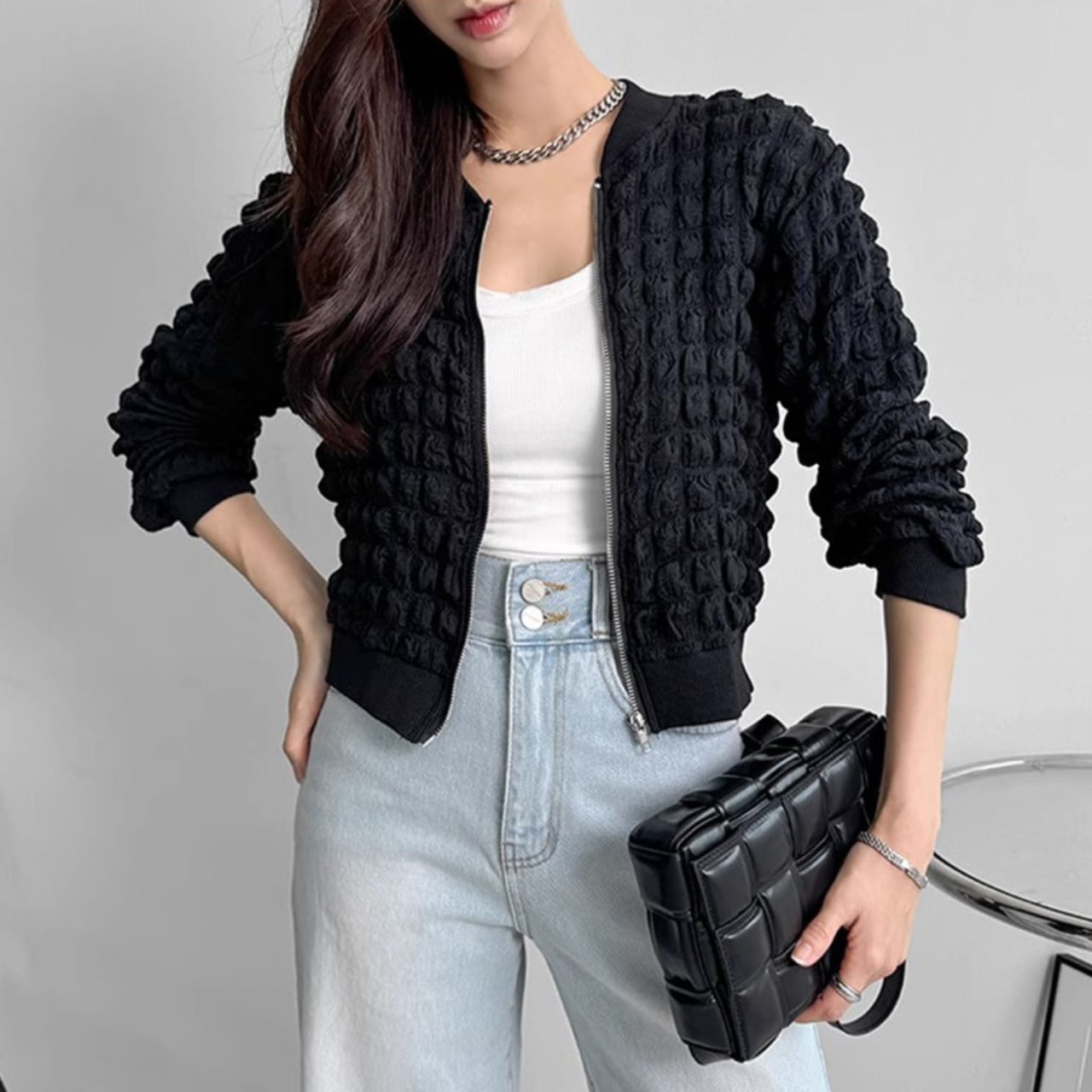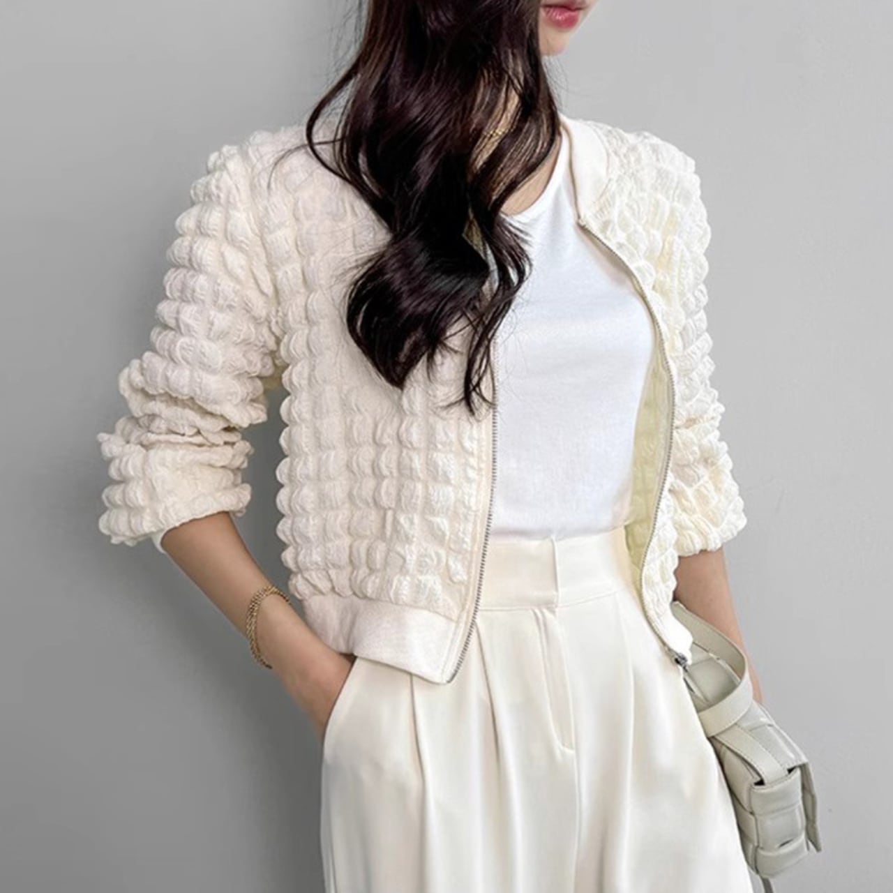 立体的なテクスチャーが印象的な、モダンで洗練されたジッパージャケット。