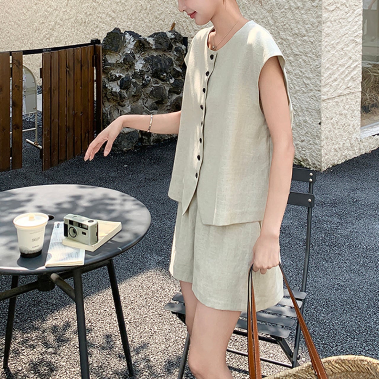 トップスは、すっきりとしたノースリーブデザインで、涼しさを感じさせる快適な着用感。縦一列に配置されたボタンがアクセントを加え、体型を選ばないリラックスしたシルエットとなっています。