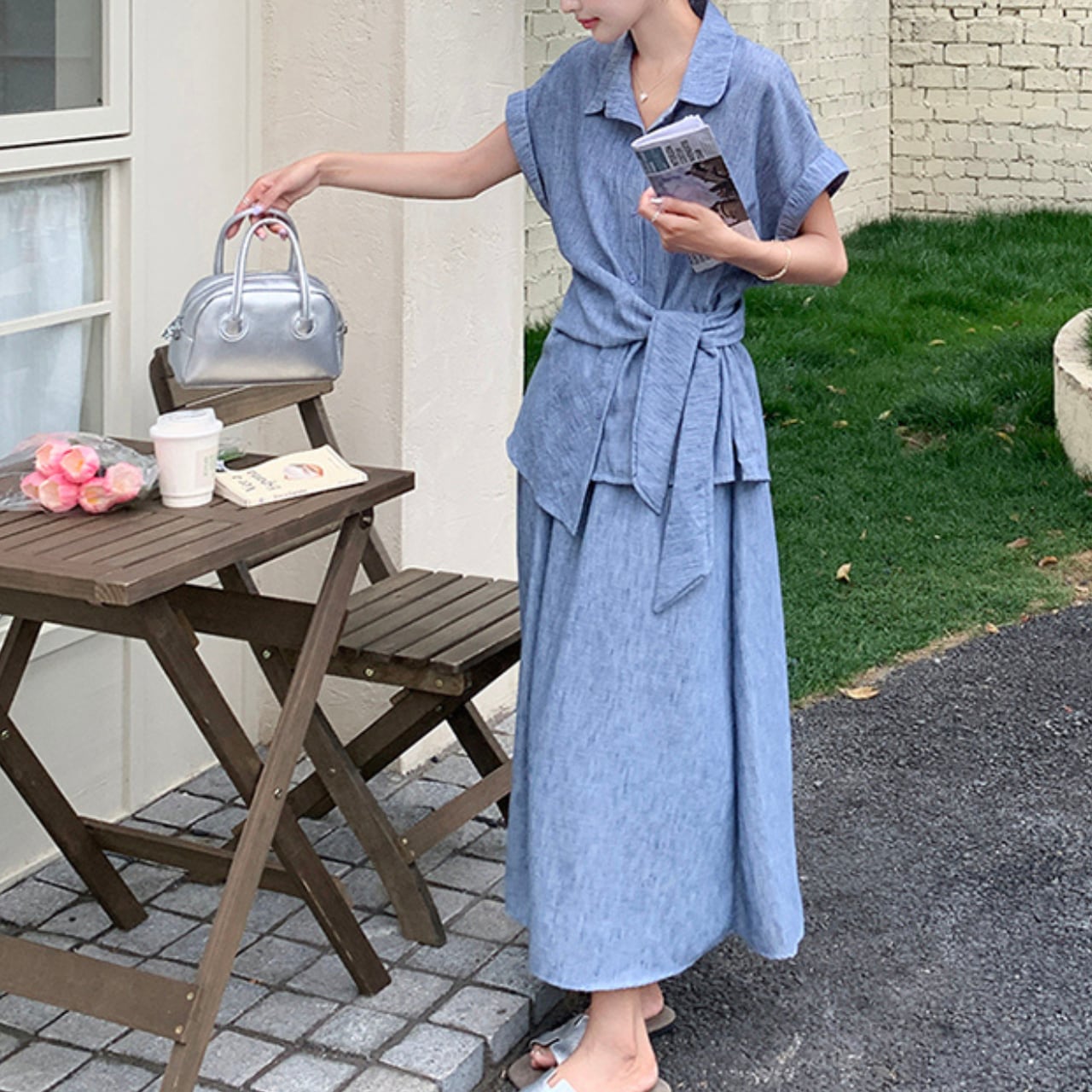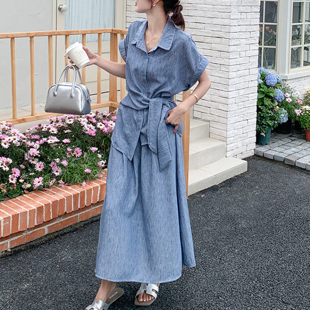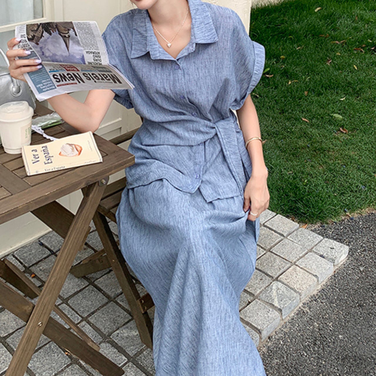 デニムのような風合いを持つブルーカラーシャツ&スカートのセットアップ。