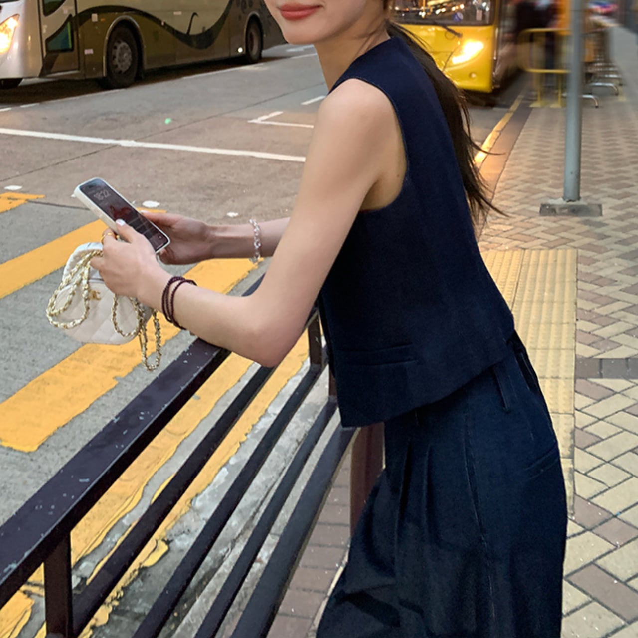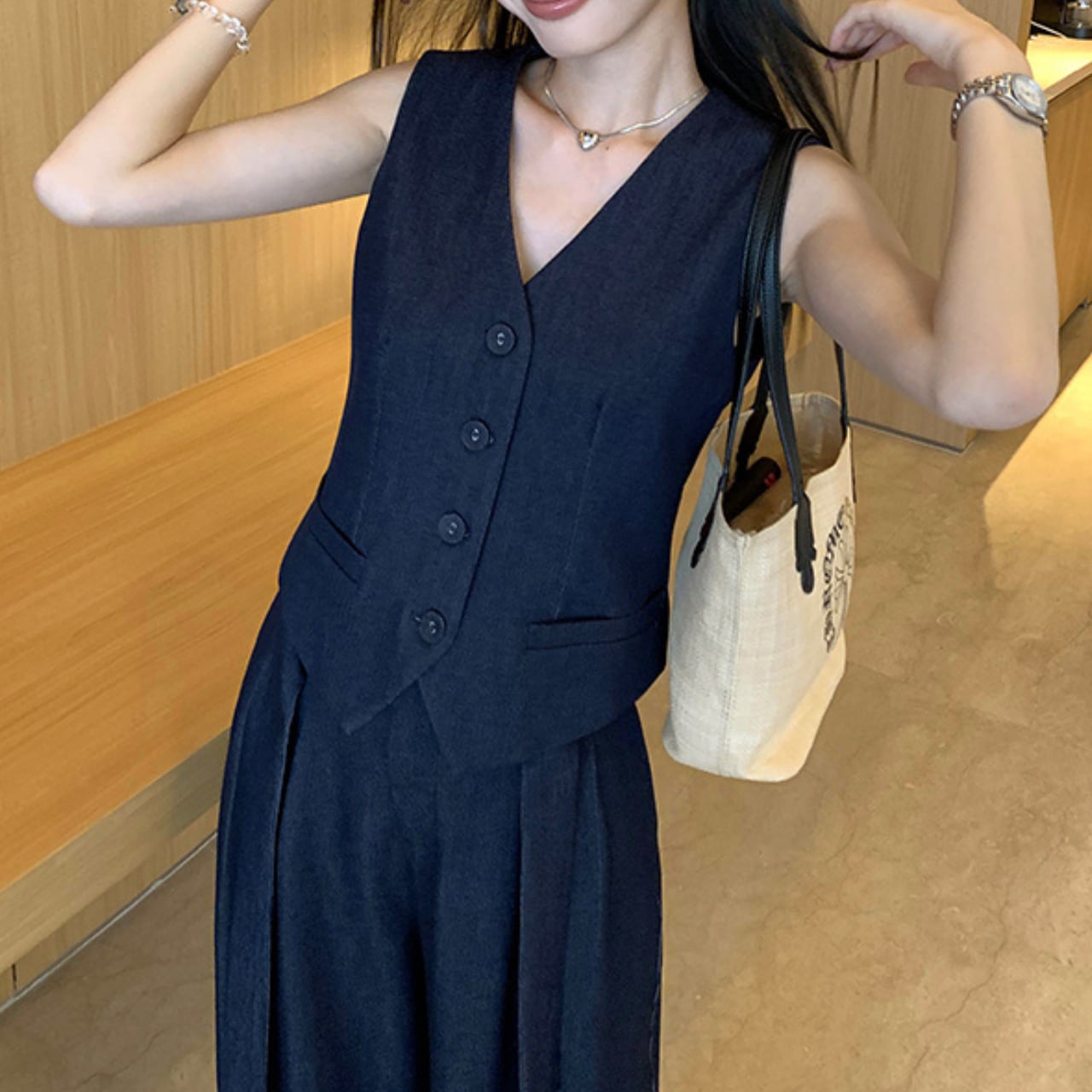Vネックベストが女性らしいデコルテラインを美しく演出し、ワイドレッグパンツが脚のラインを優雅にカバーしながら、トレンド感のあるモダンなスタイルを実現します。