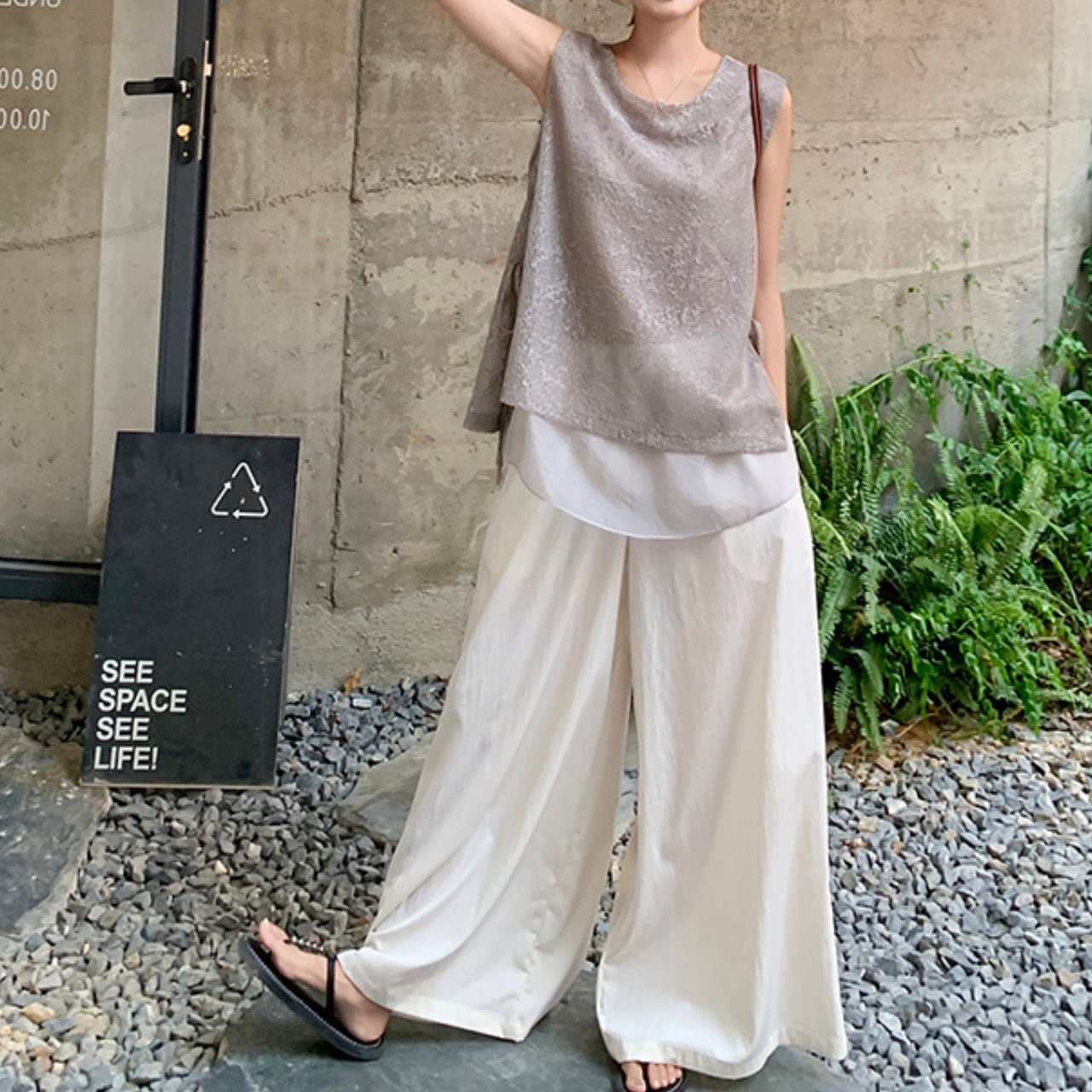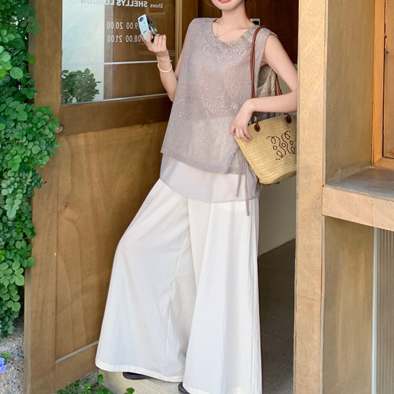 上品でありながらもスタイリッシュな印象を与える、シアーベスト&ワイドレッグパンツセット。