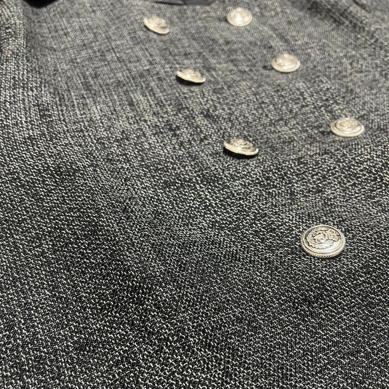 グレーの上品なカラーが魅力的なダブルジャケット&ワイドレッグパンツのセットアップ。