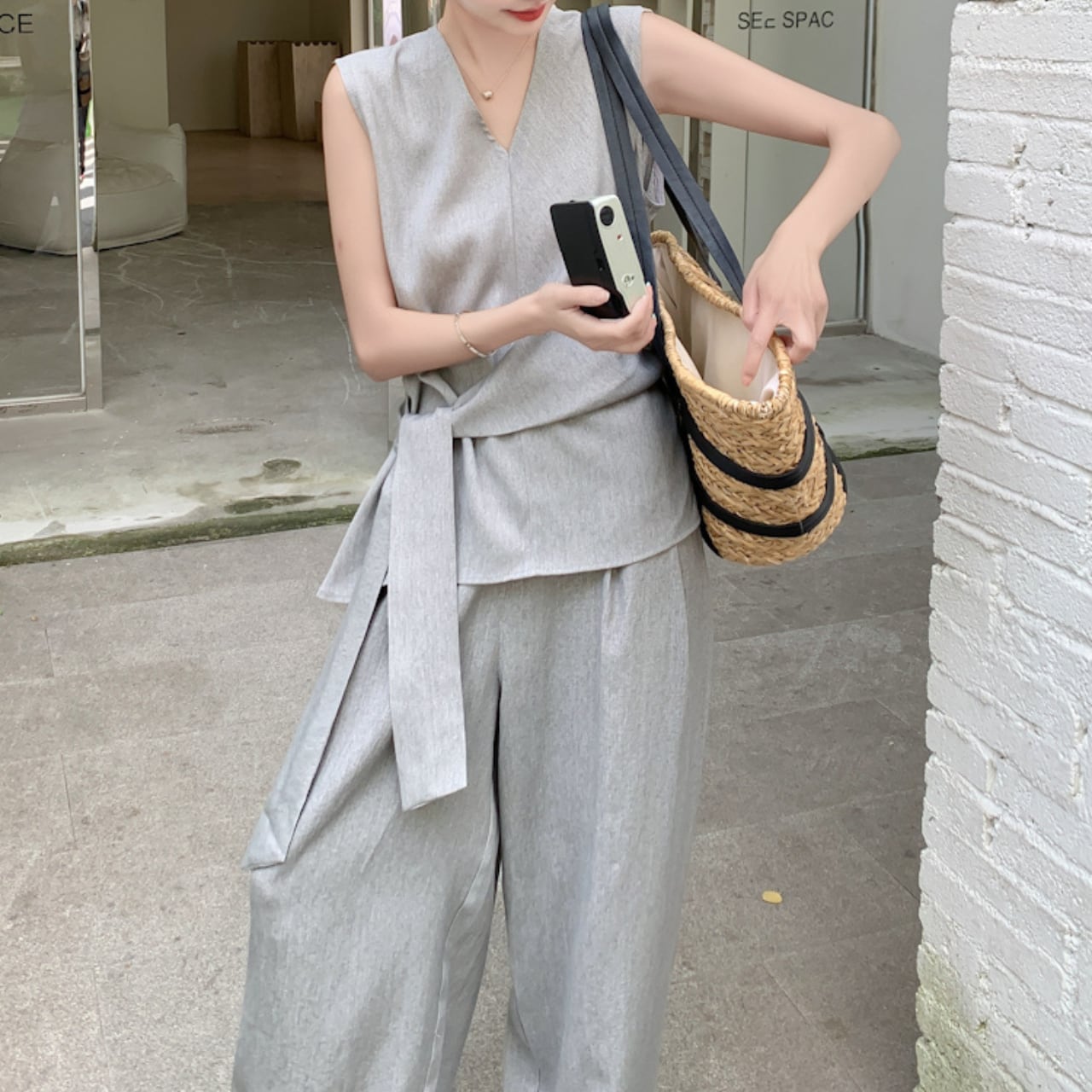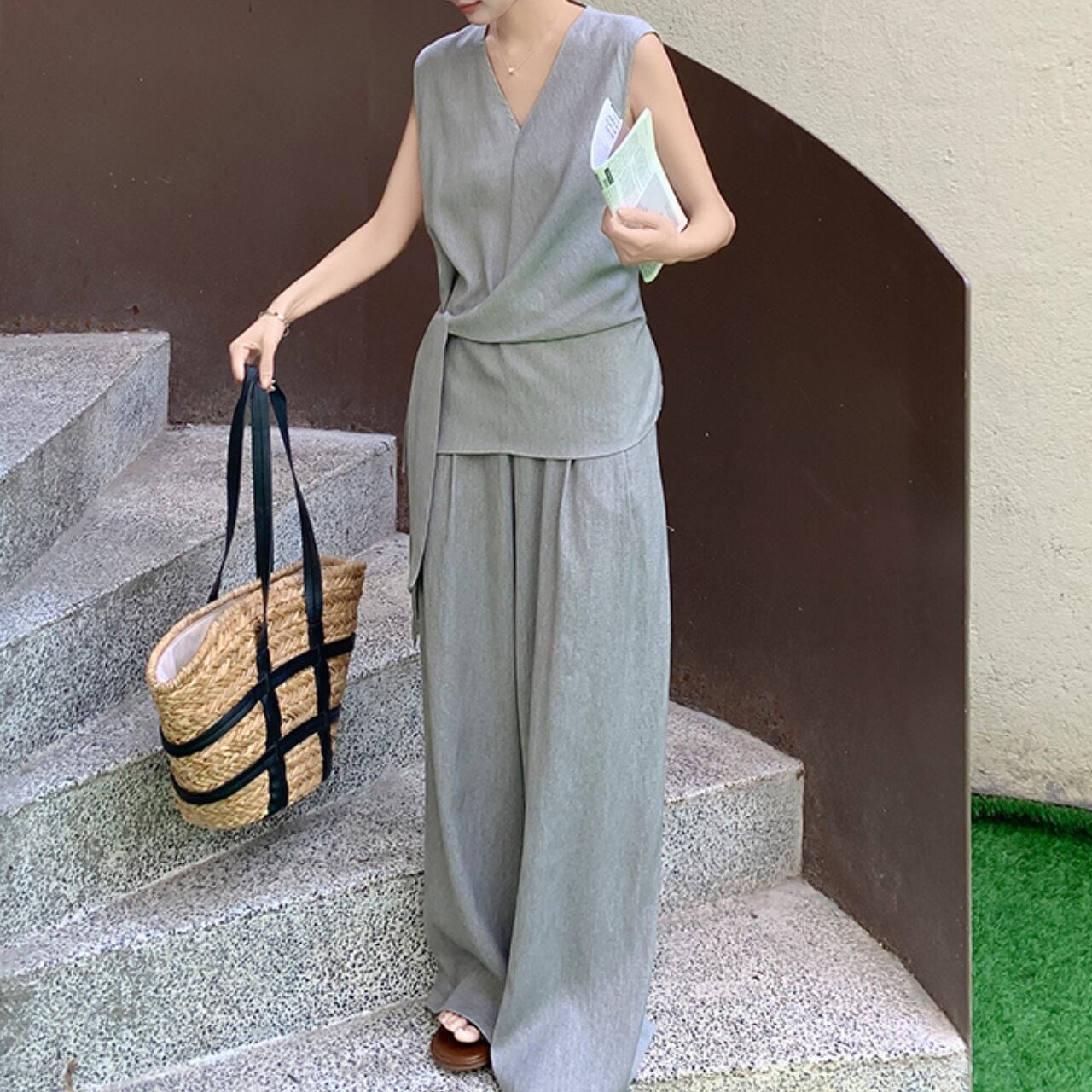 高級感のあるグレーカラーで上品な印象を与えるウエストタイトップス&ワイドレッグパンツのセットアップ。