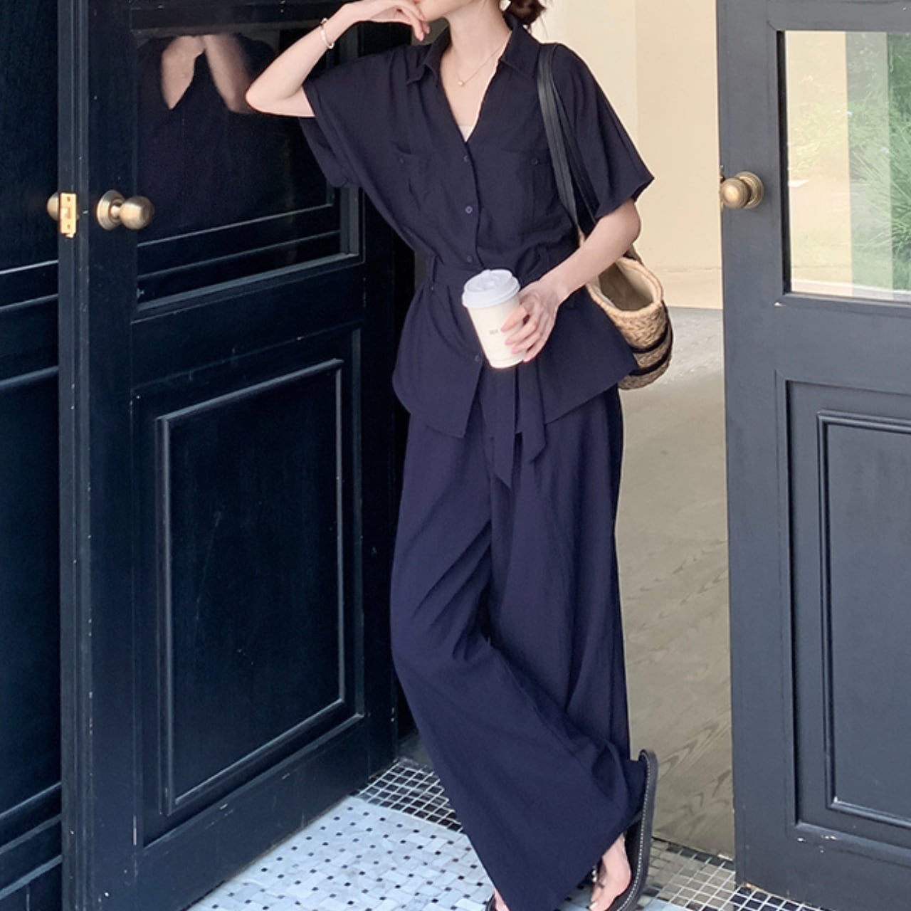 高級感漂うブラックカラーのシャツ&ワイドレッグパンツのセットアップ。