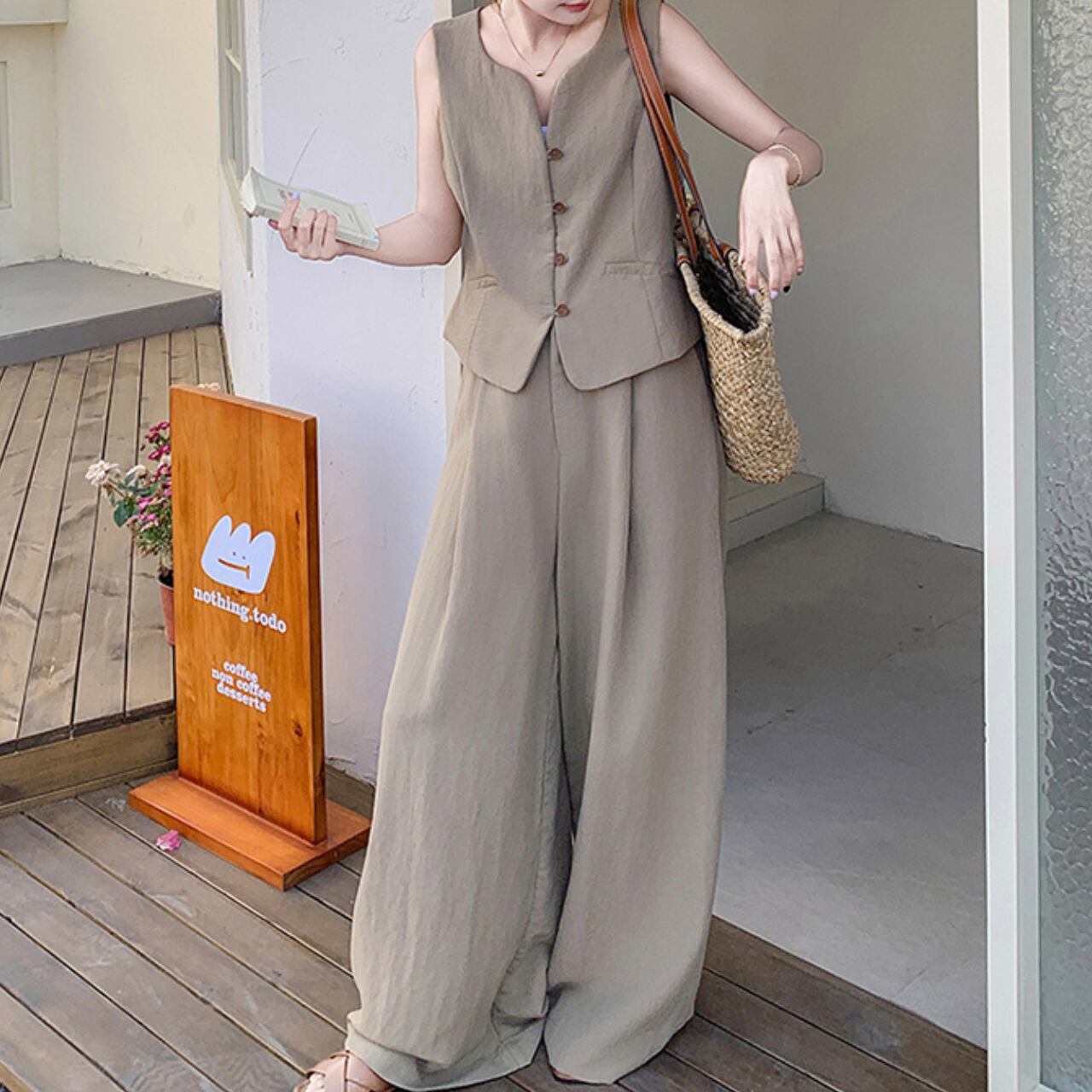 クラシックなテーラードベスト&ワイドレッグパンツのセットアップです。