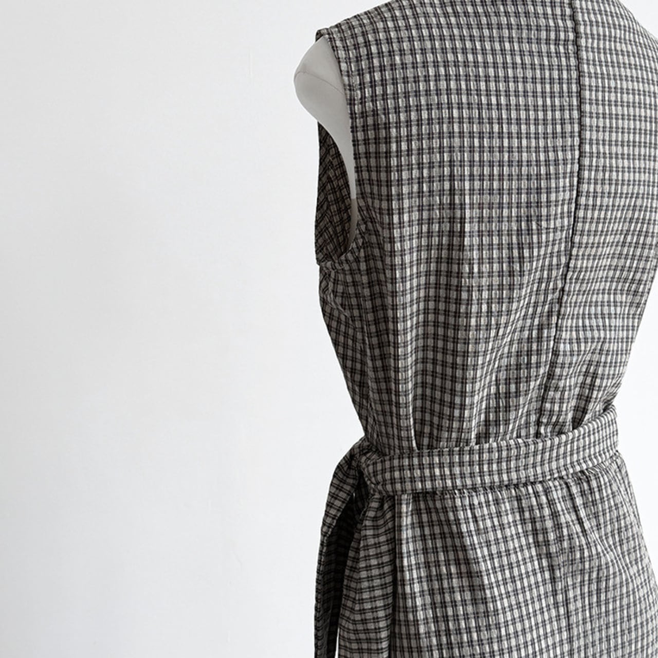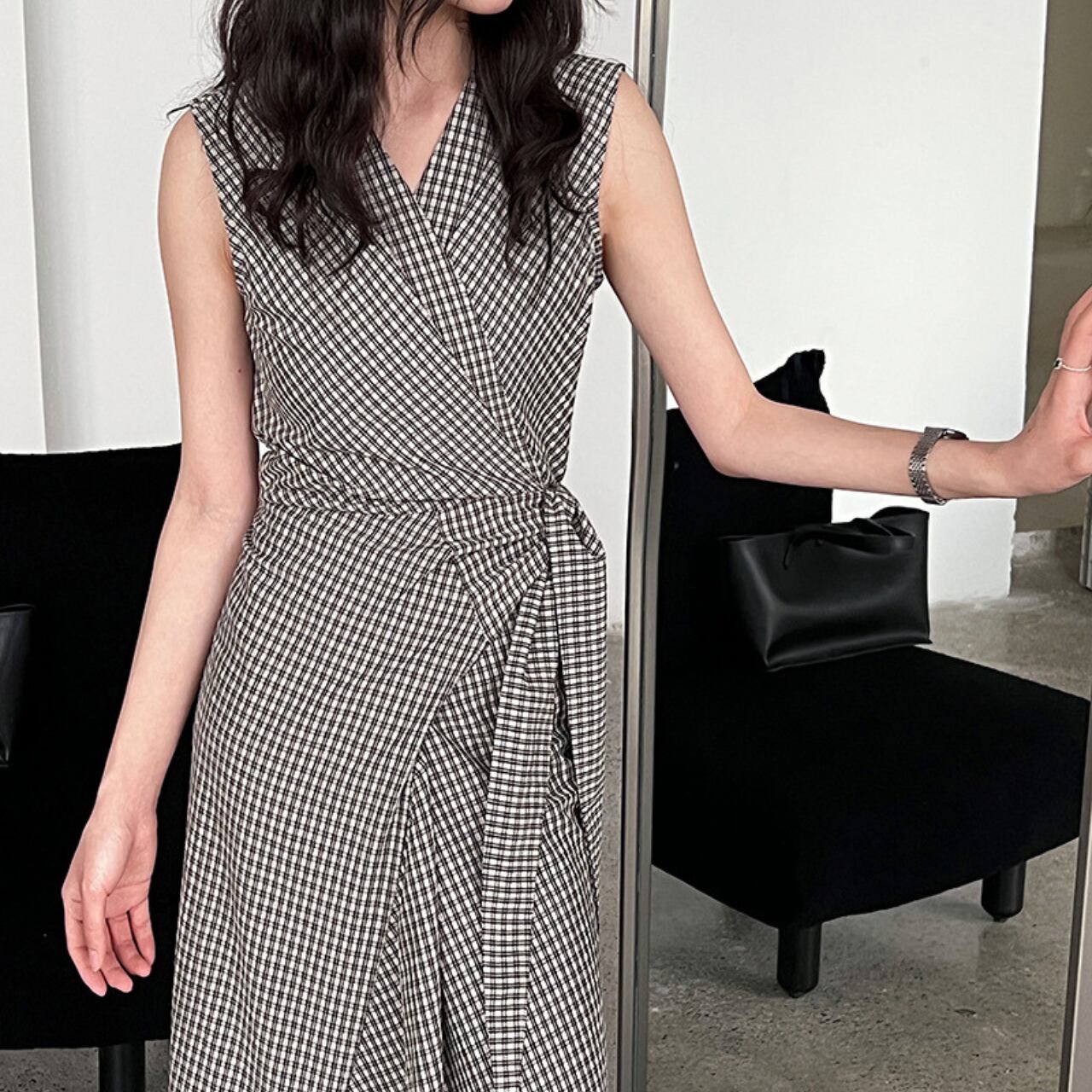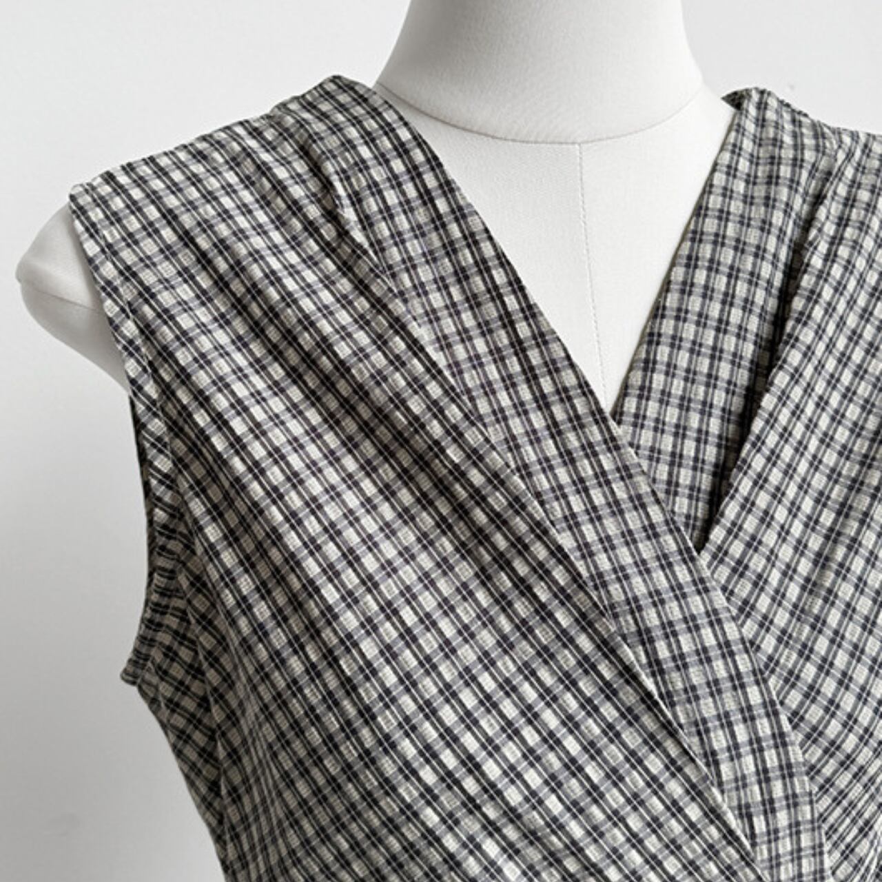 クラシックなギンガムチェック柄が上品な印象を演出し、深めのVネックラインが女性らしいデコルテを美しく見せます。
