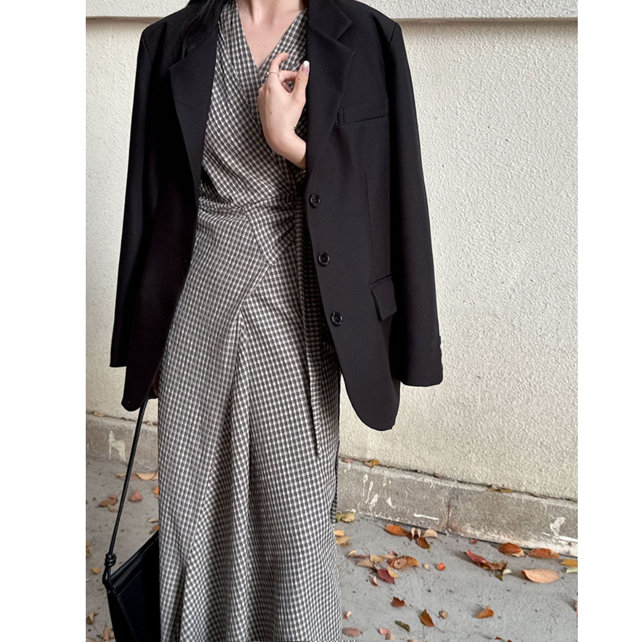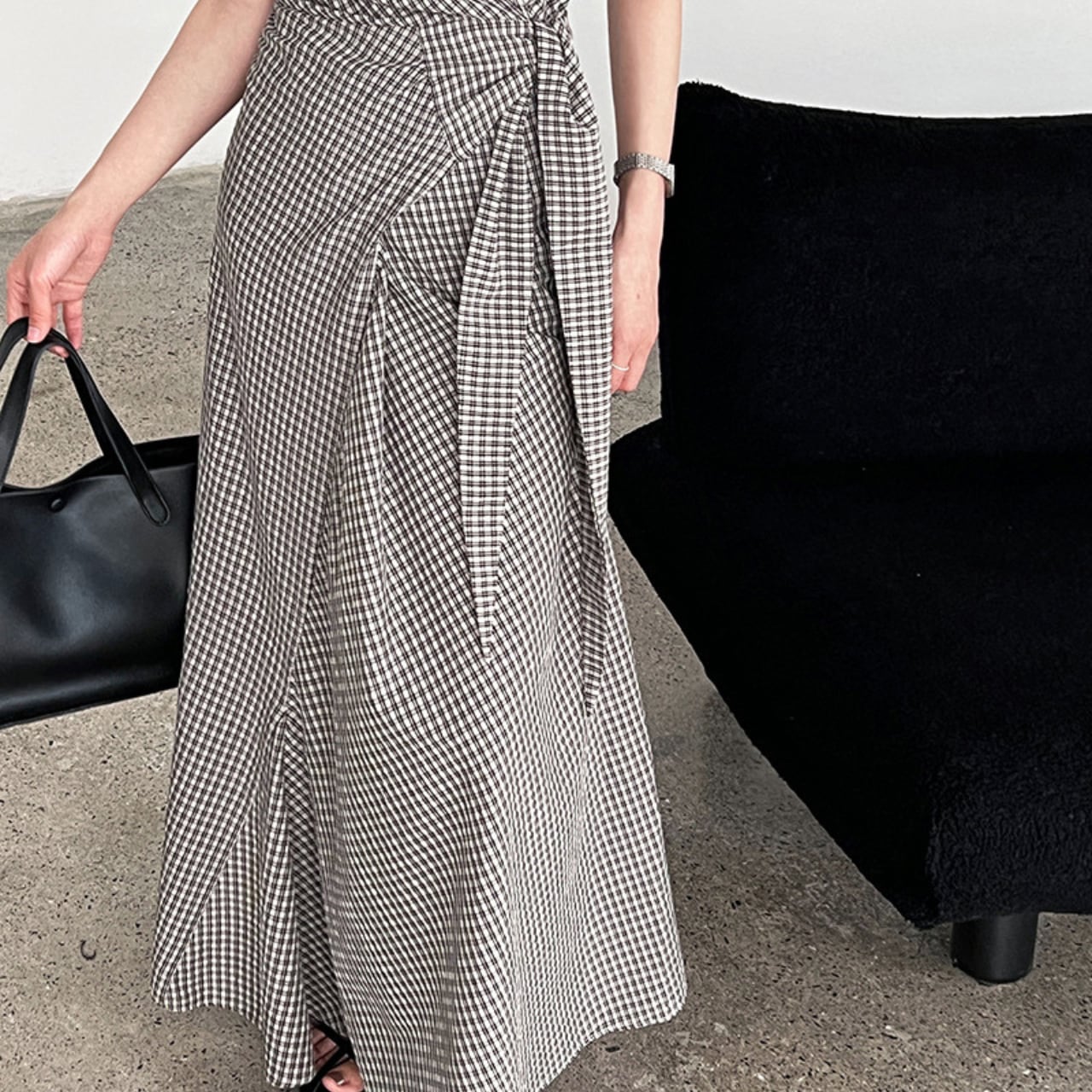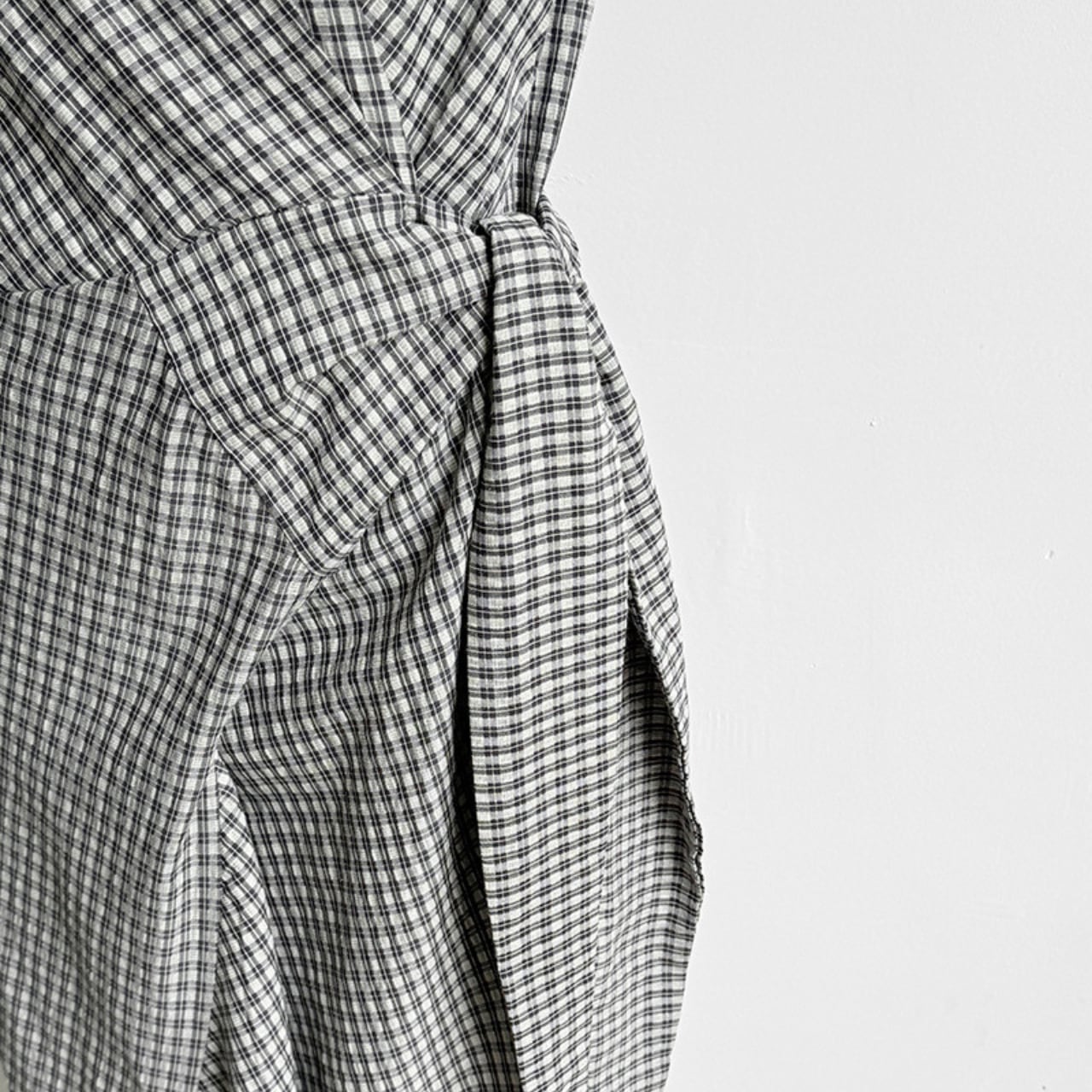 クラシックなギンガムチェック柄が上品な印象を演出し、深めのVネックラインが女性らしいデコルテを美しく見せます。