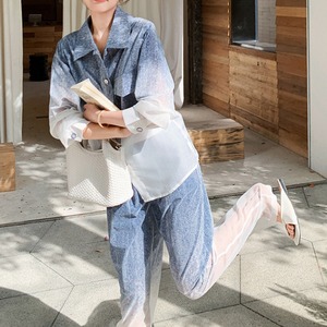 ブルーから透明感のあるホワイトへと美しく移り変わるグラデーションデザインのセットアップ。グラデーションの配色が独自のスタイルを引き立てます。光の当たり方で表情を変える、まさにアート感覚のアイテムです。
