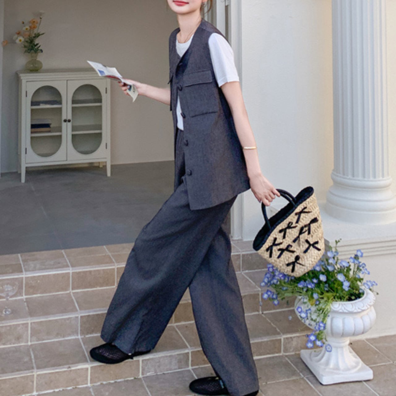 トレンド感溢れるTシャツ、ベスト、ワイドレッグパンツのセットアップで、いつものコーディネートをワンランクアップ。