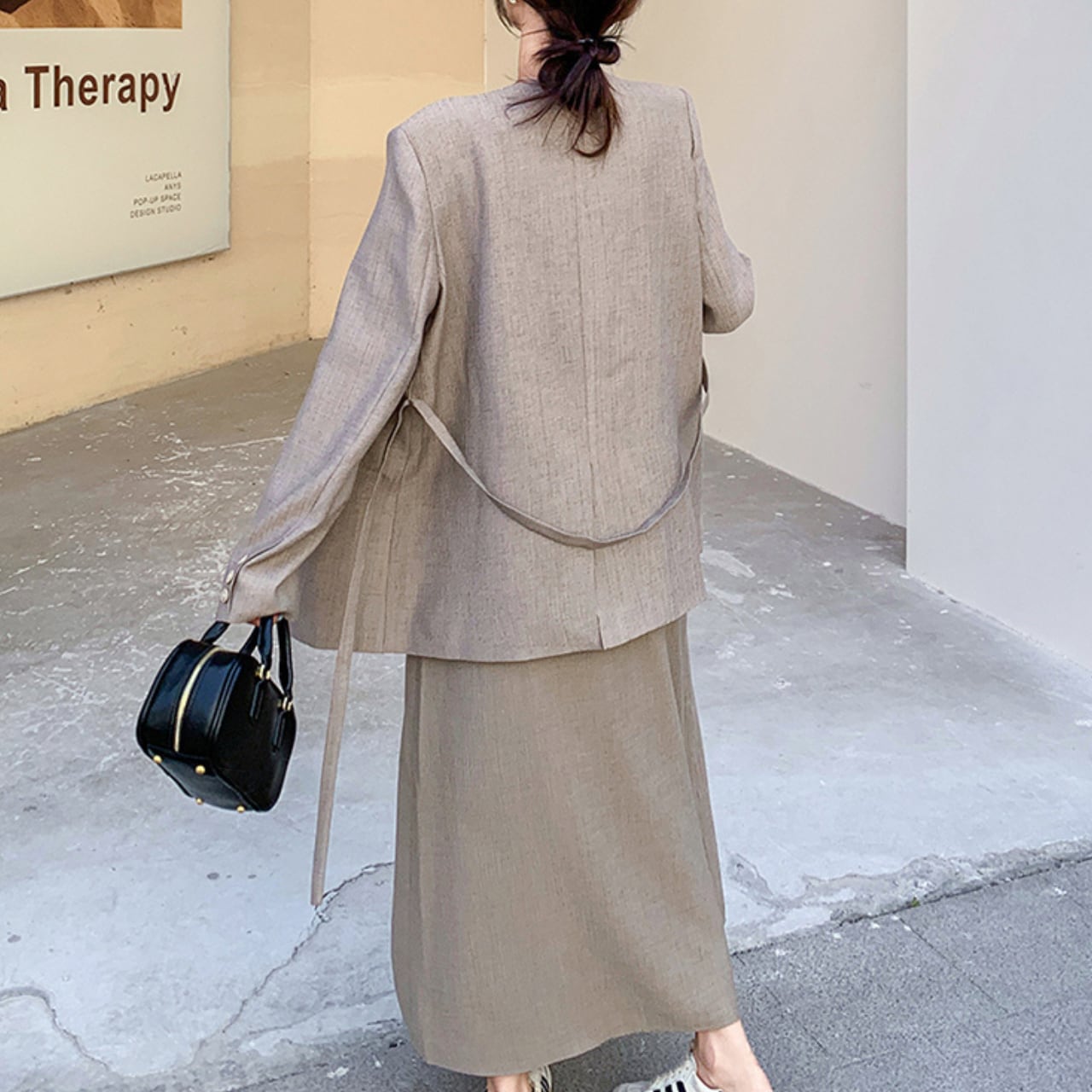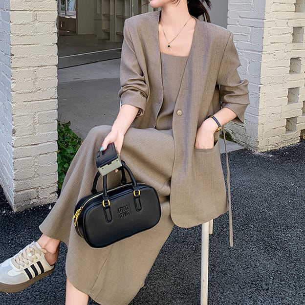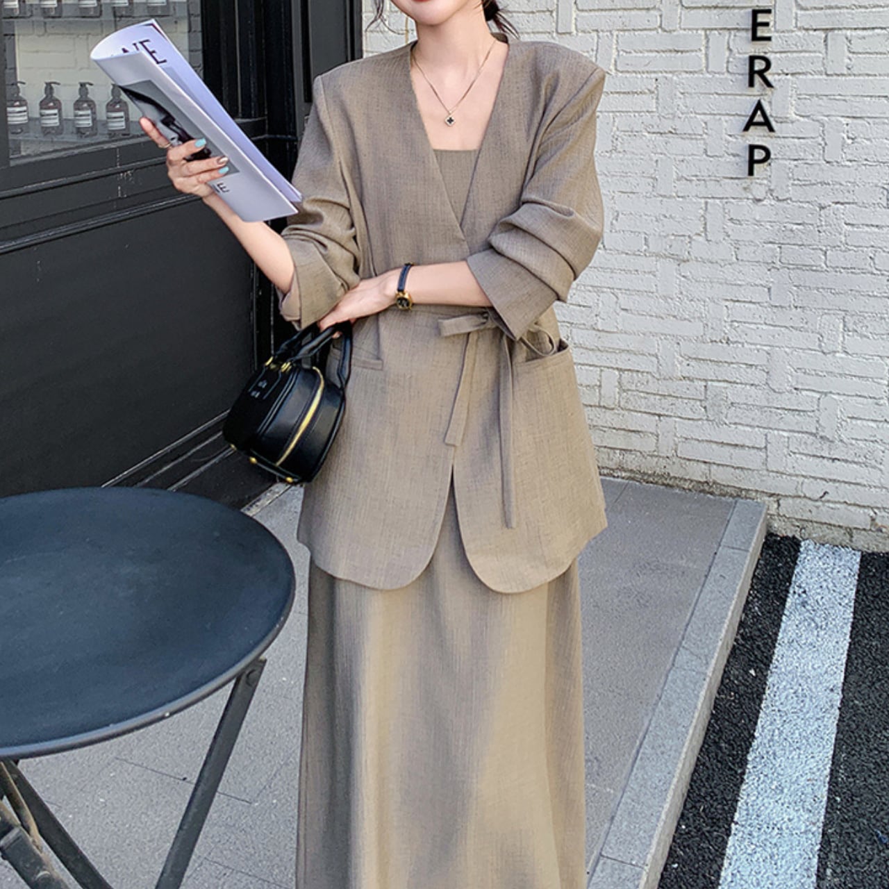 トレンド感溢れるテーラードジャケットとキャミソールワンピースのセットアップ。