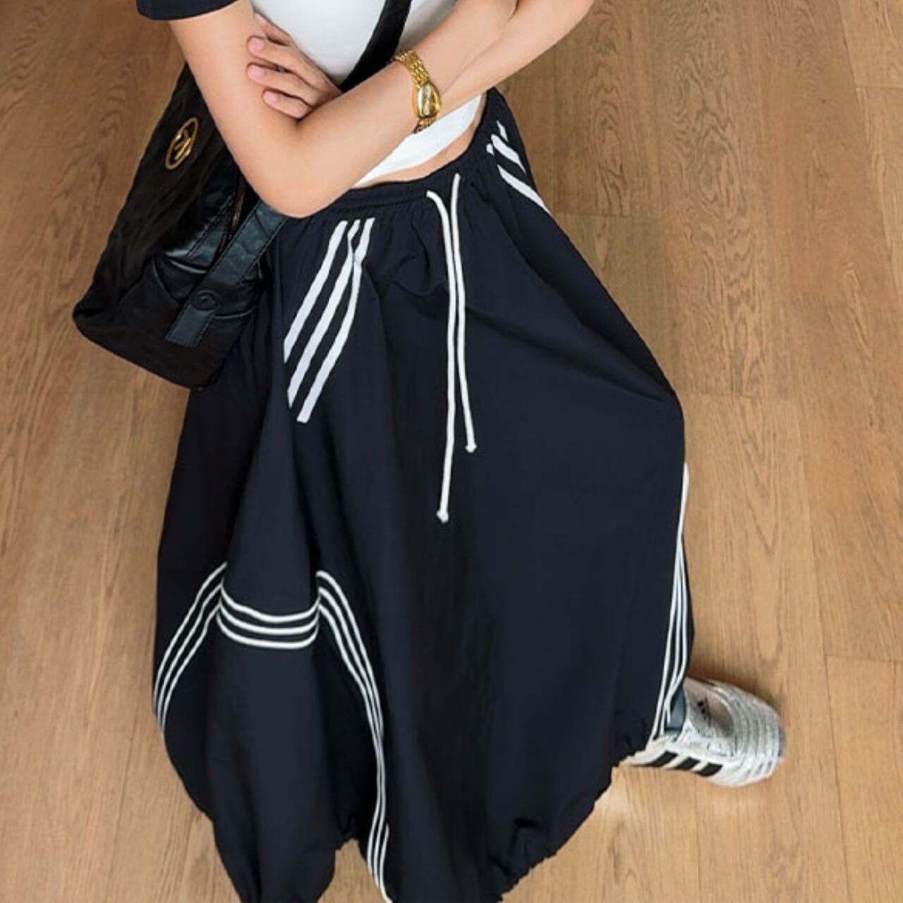クラシックなスポーツウェアからインスパイアされたこちらのスカートは、カジュアルからストリートスタイルまで幅広いコーディネートに対応。白いラインデザインがモダンでスタイリッシュな印象を演出します。