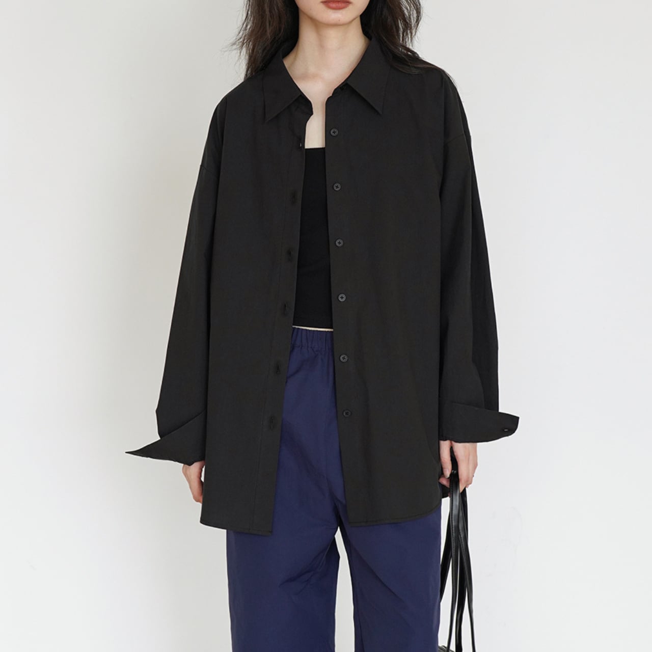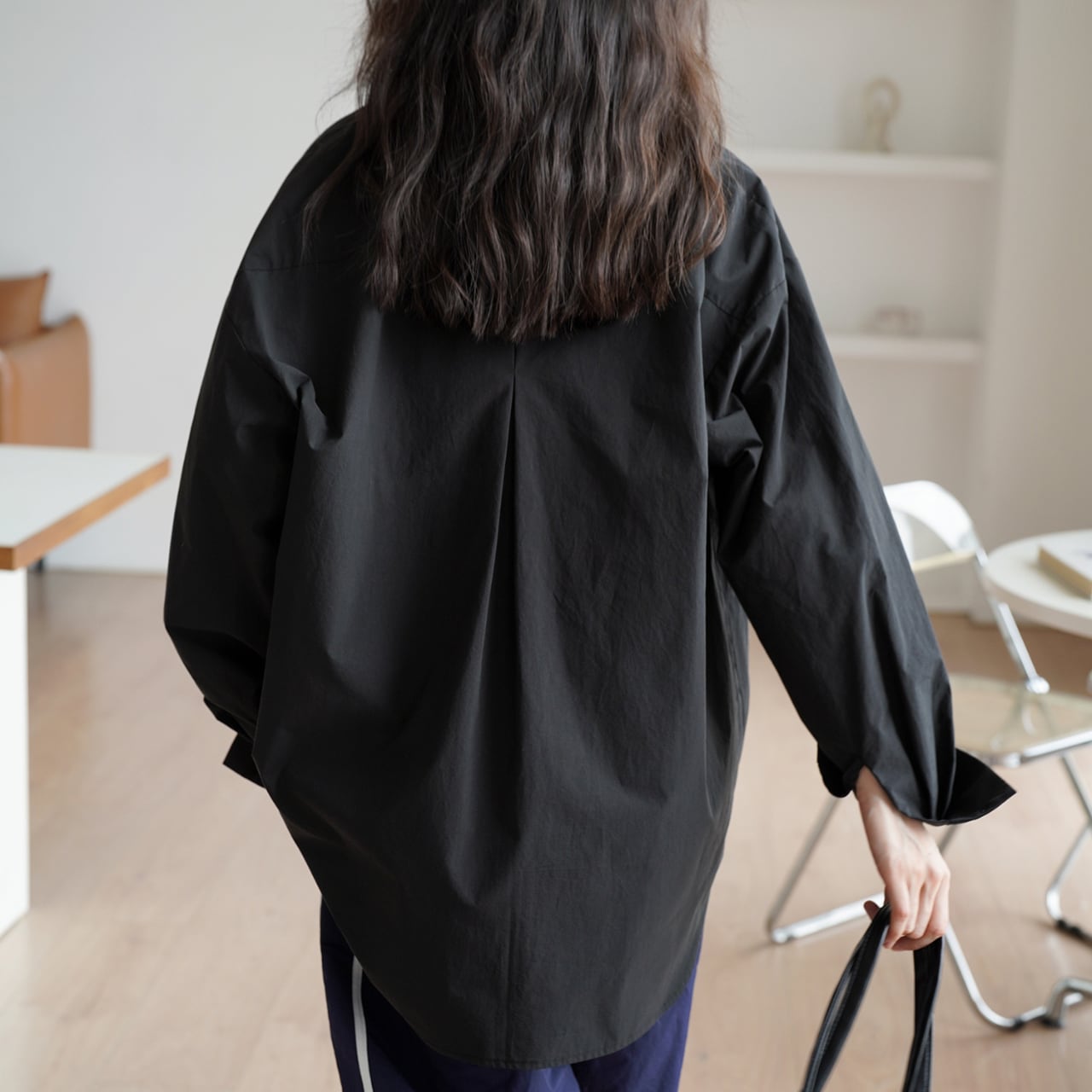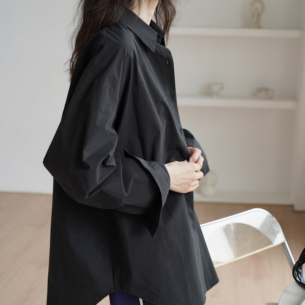 深みのあるブラックカラーとゆったりとしたオーバーサイズシルエットが、エフォートレスな大人の品格を演出。一枚で様になる存在感のあるデザインです。