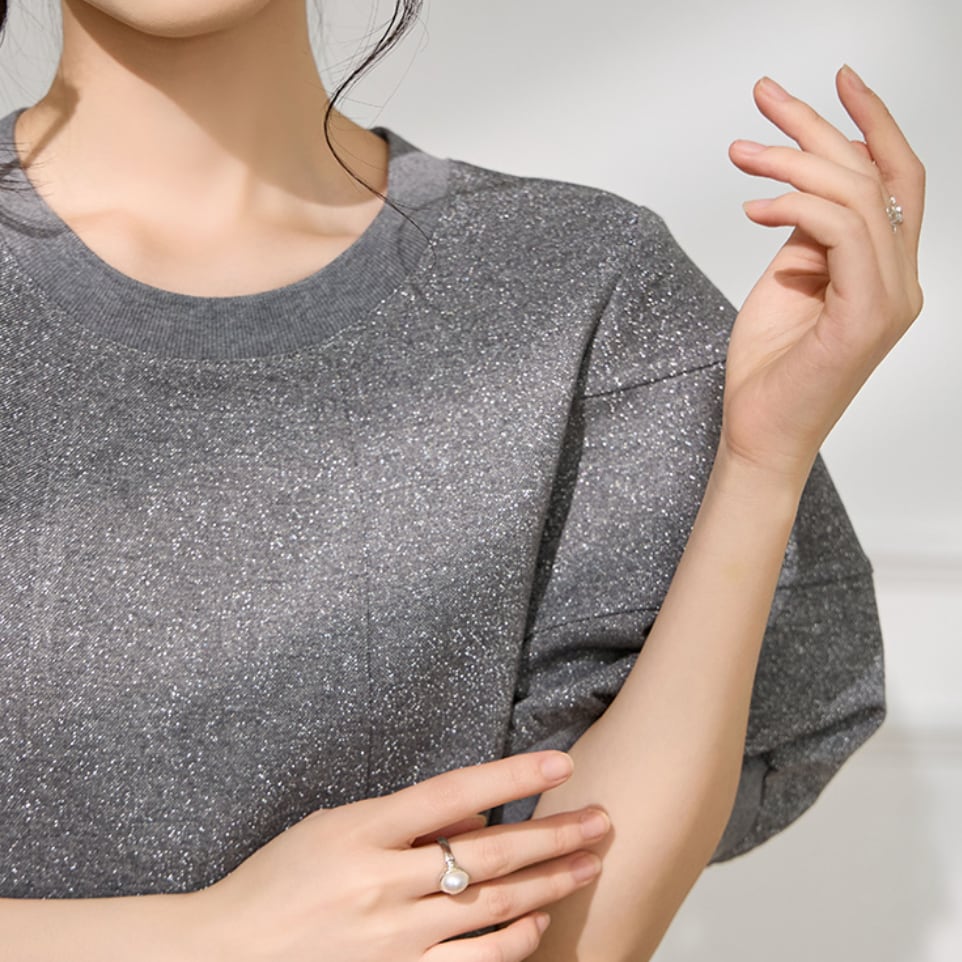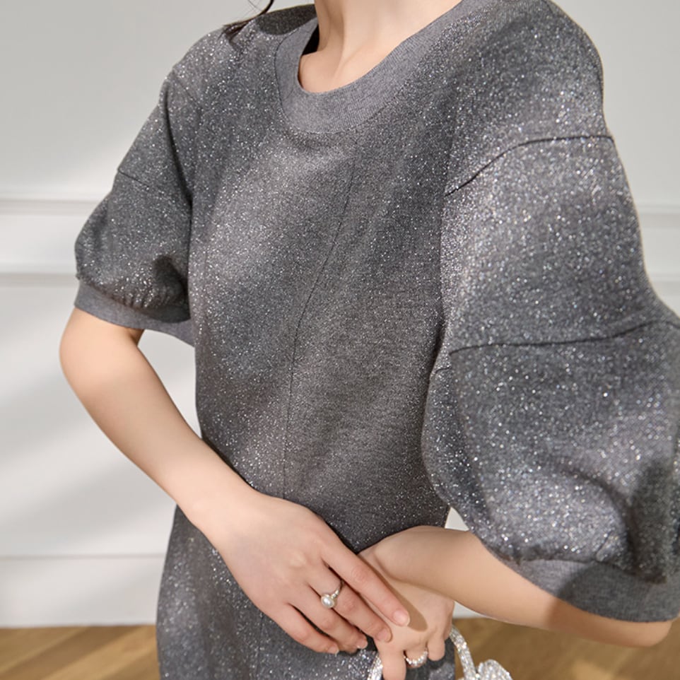 細やかなラメが織り込まれたグレー生地は、光の当たり方によって表情を変える特別な仕上がり。派手すぎず上品な輝きで、どんなシーンでも品格を演出します。