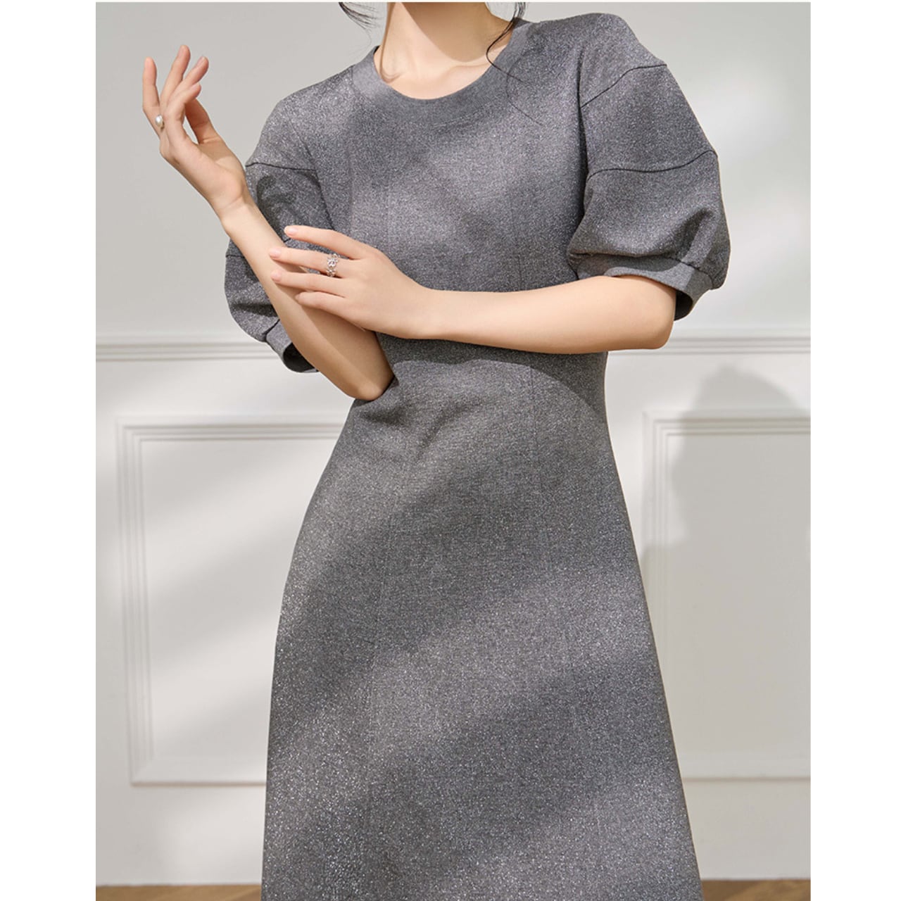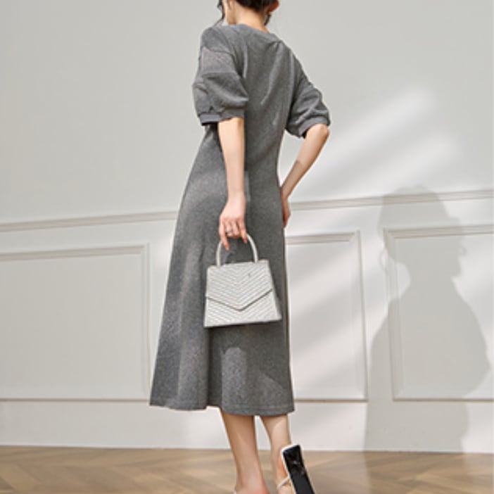 落ち着いたグレーカラーのパフスリーブワンピース。