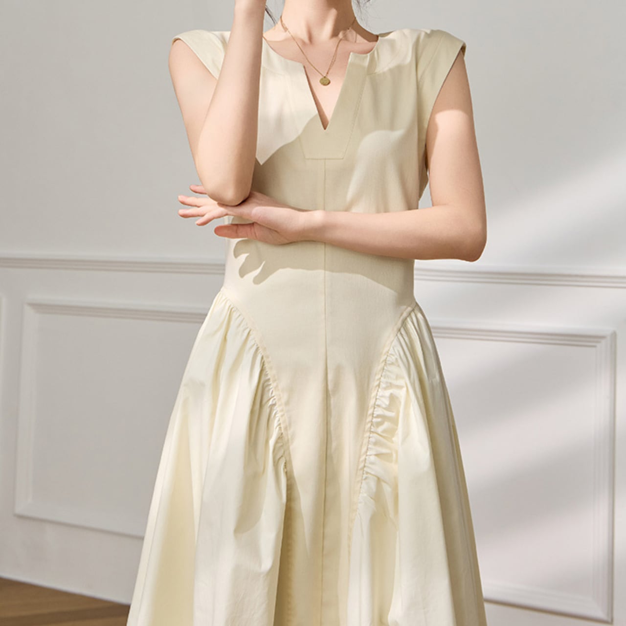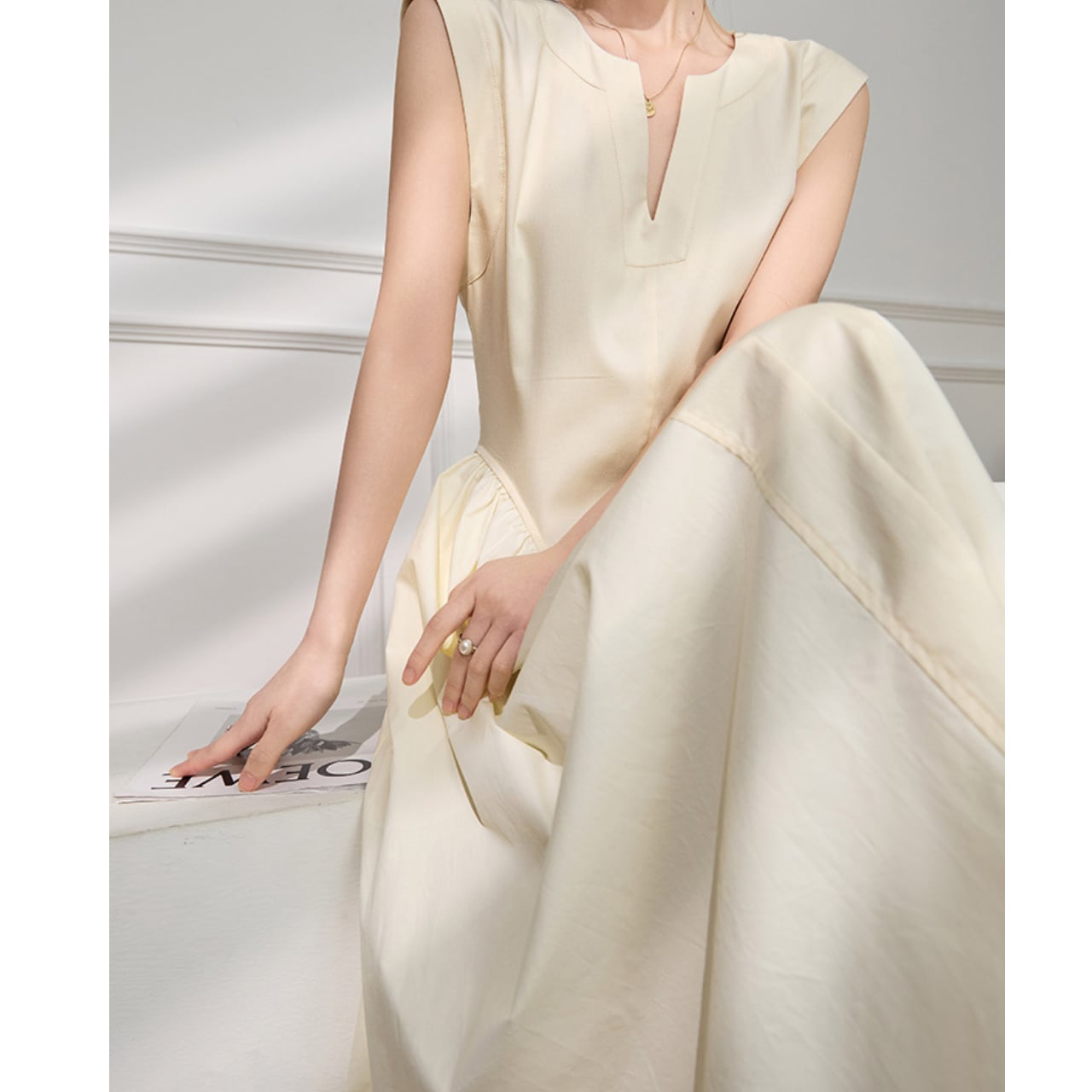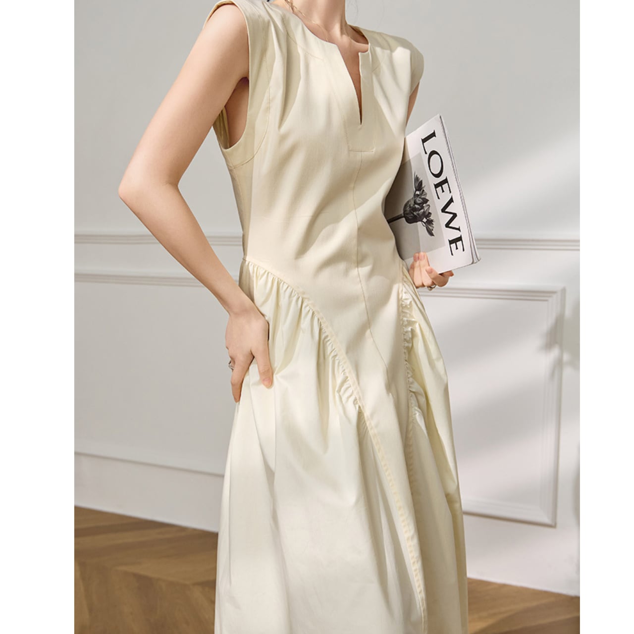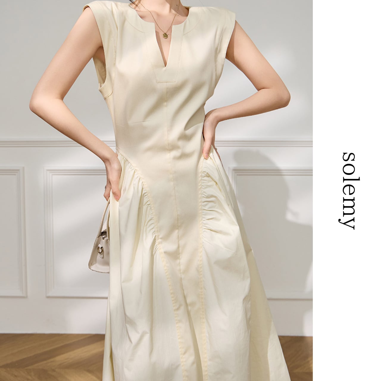 ノースリーブデザインは腕のラインをすっきりと見せ、軽やかな印象を与えます。
