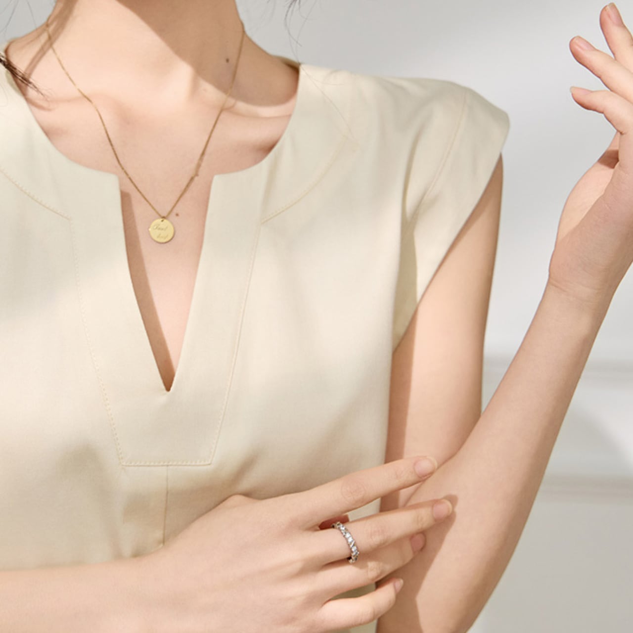 上品なVネックラインがデコルテを美しく見せながら、品のある仕上がりに。