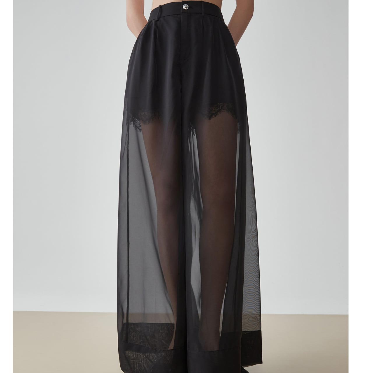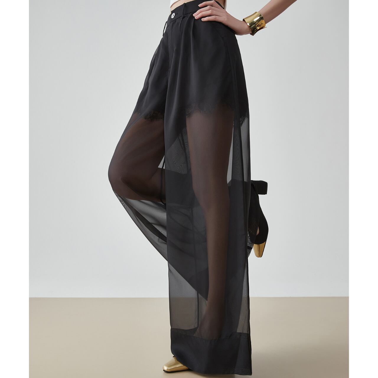 透け感のある素材が魅力的なブラックシアーワイドパンツ。