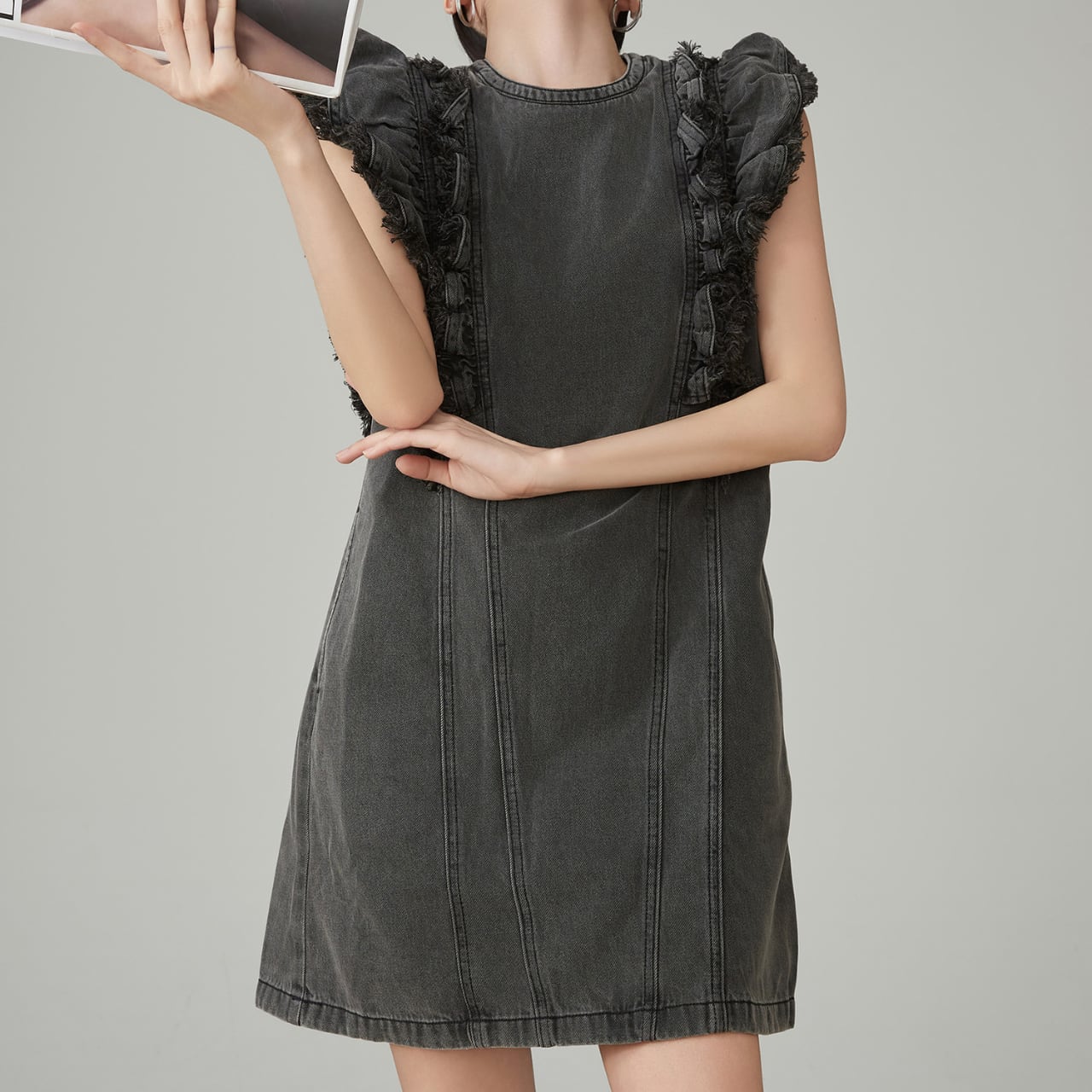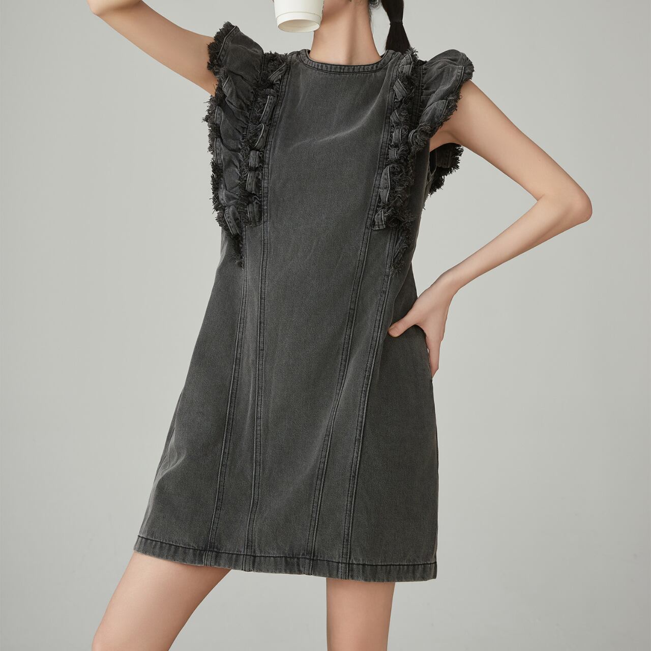 デニムにモードなフリンジディテールをプラスした、個性派のためのワンピース。