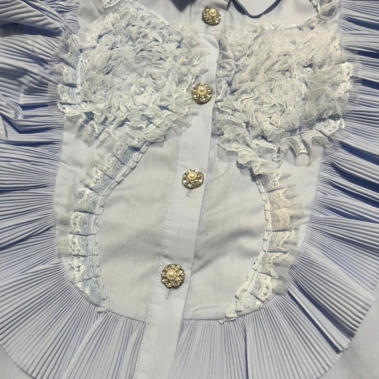 袖と胸元に配された繊細なプリーツが、クラシカルな品格を演出。動くたびに美しく揺れ、女性らしい優雅さを際立たせます。