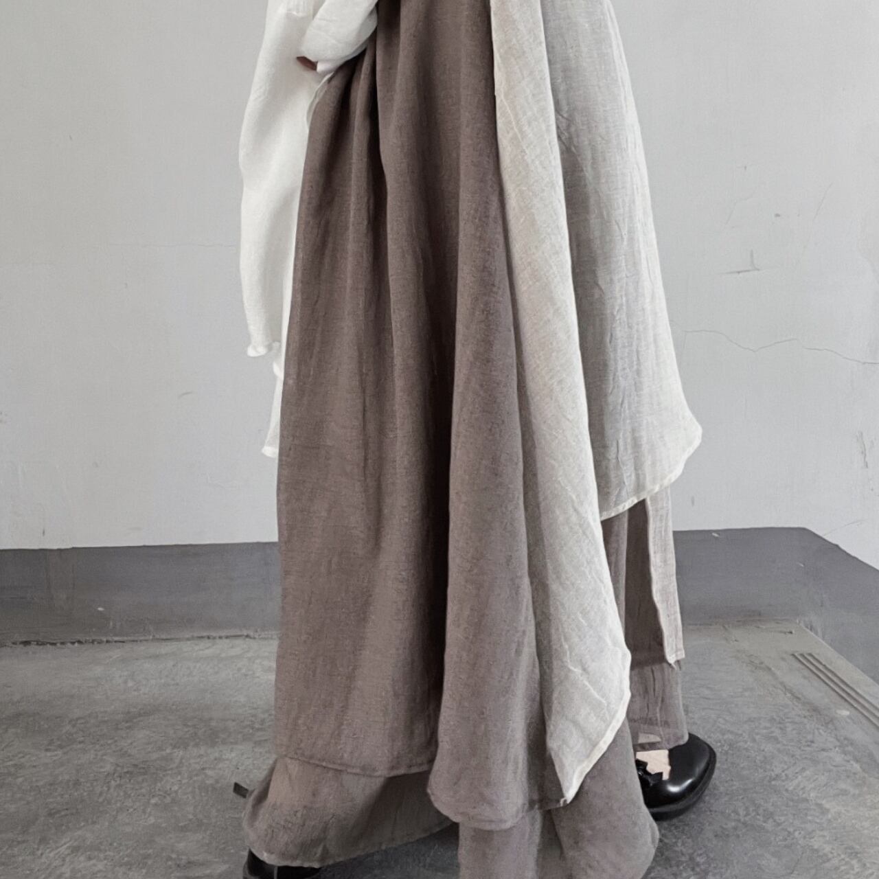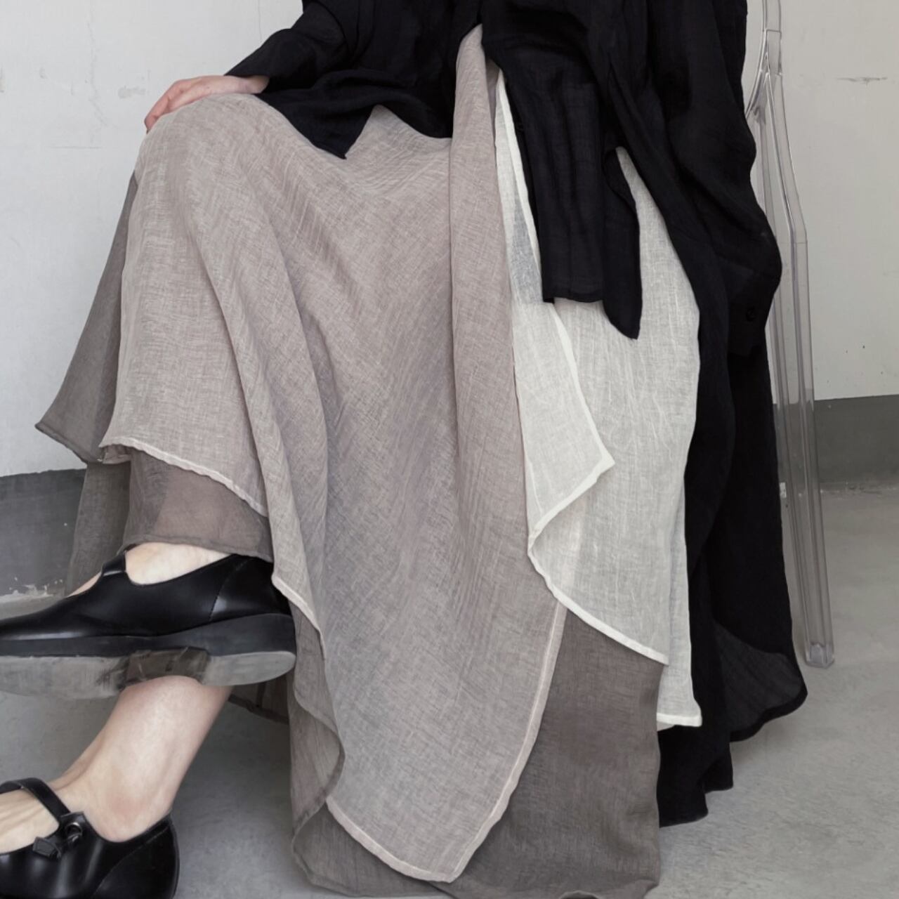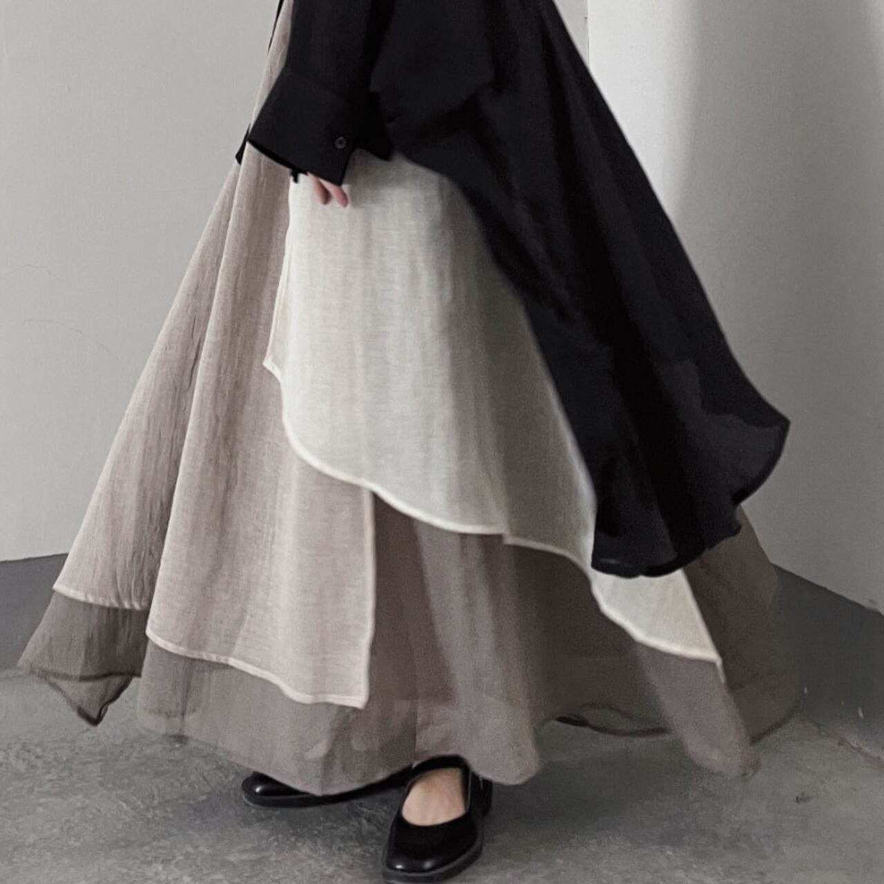異なる丈感の生地を重ね合わせたレイヤードデザインスカート。
