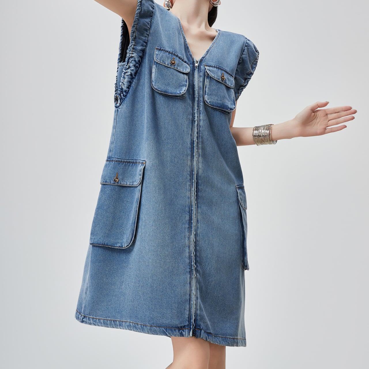 クールなデニム素材に、袖のフリルディテールが加わったワンピース。
