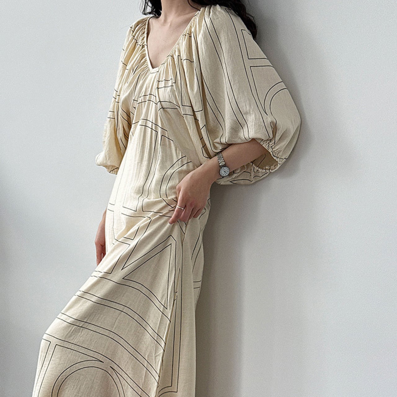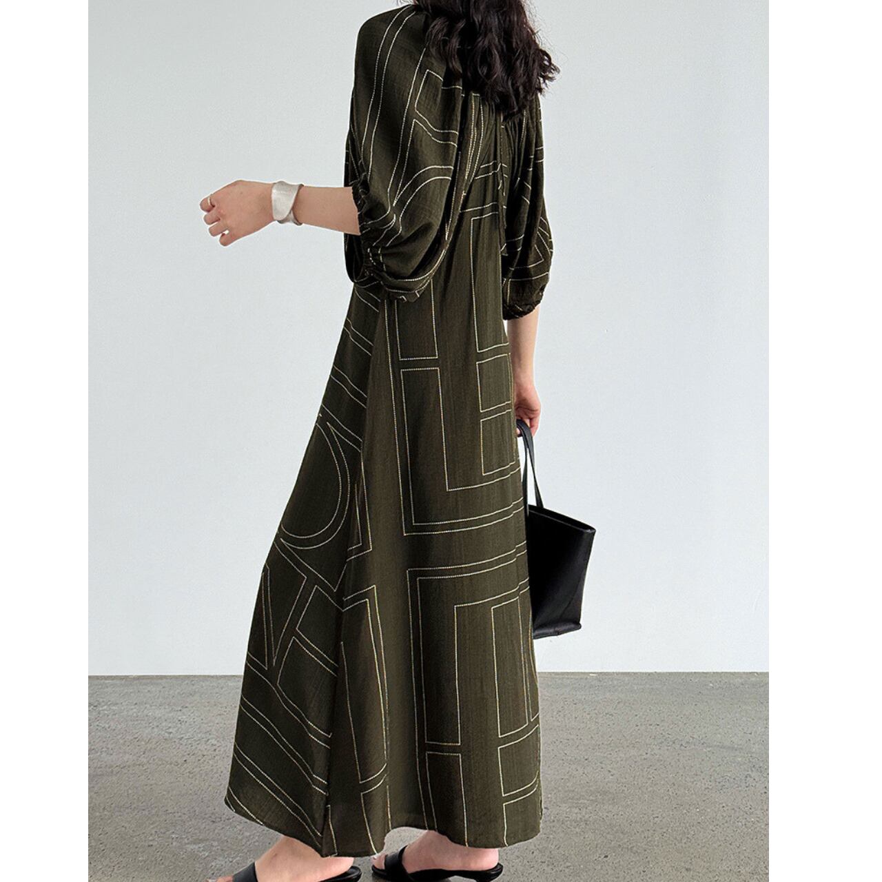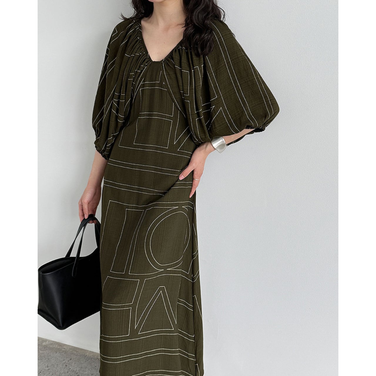 深めのVネックが洗練された大人の魅力を演出。ボリューミーな袖とタイトな身頃のメリハリ効果。マキシ丈で縦ラインを強調し、スタイルアップ効果抜群です。
