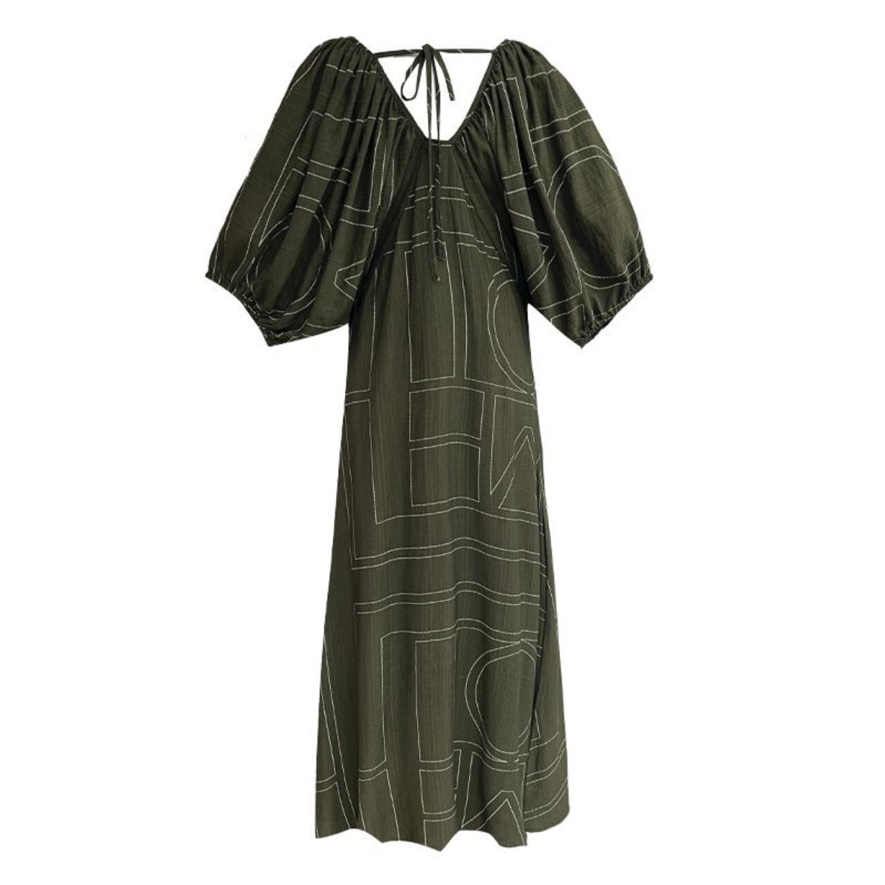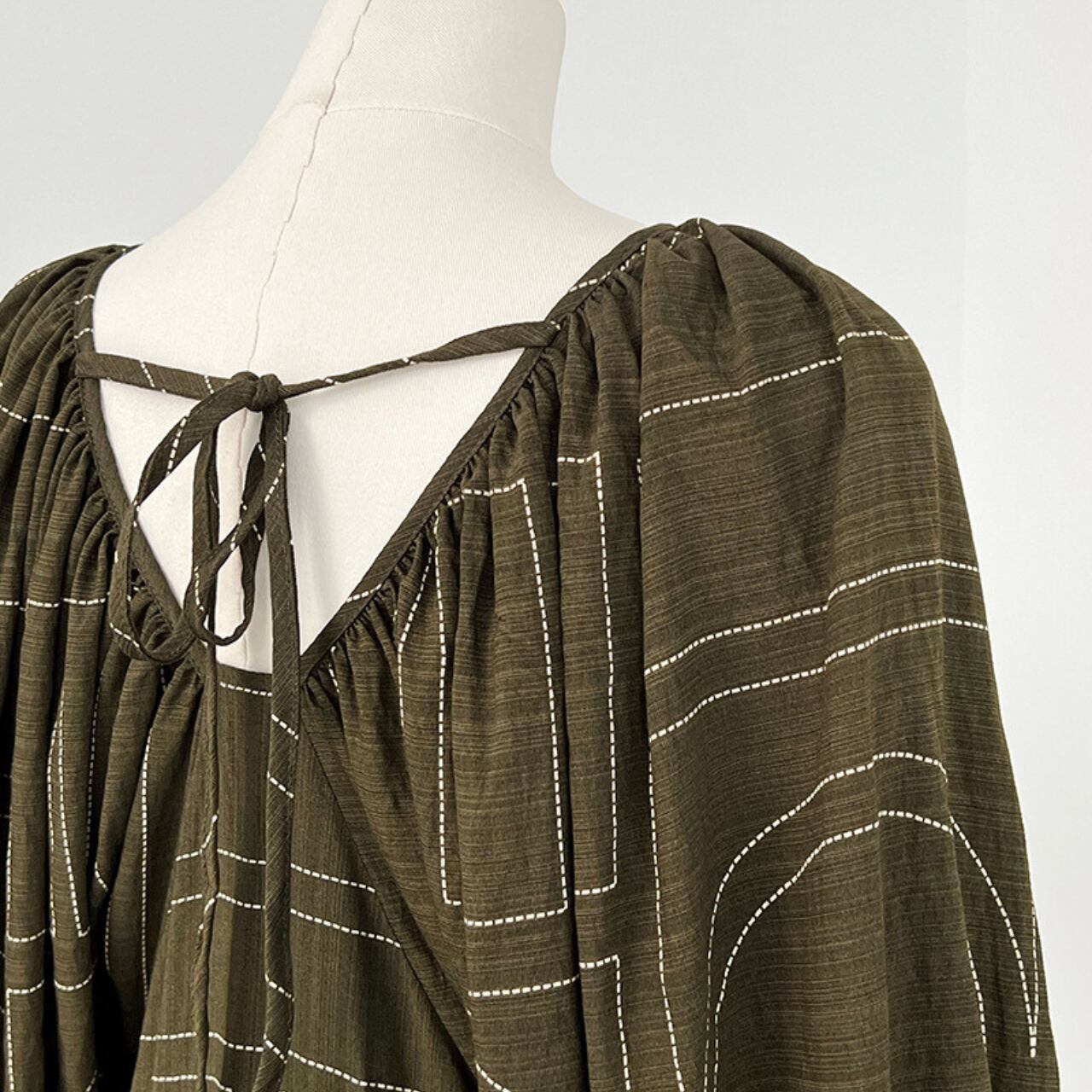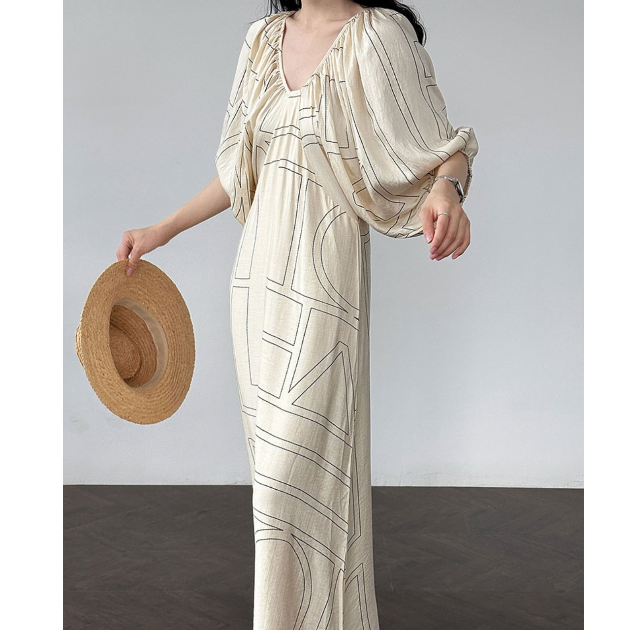 深めのVネックが洗練された大人の魅力を演出。ボリューミーな袖とタイトな身頃のメリハリ効果。マキシ丈で縦ラインを強調し、スタイルアップ効果抜群です。