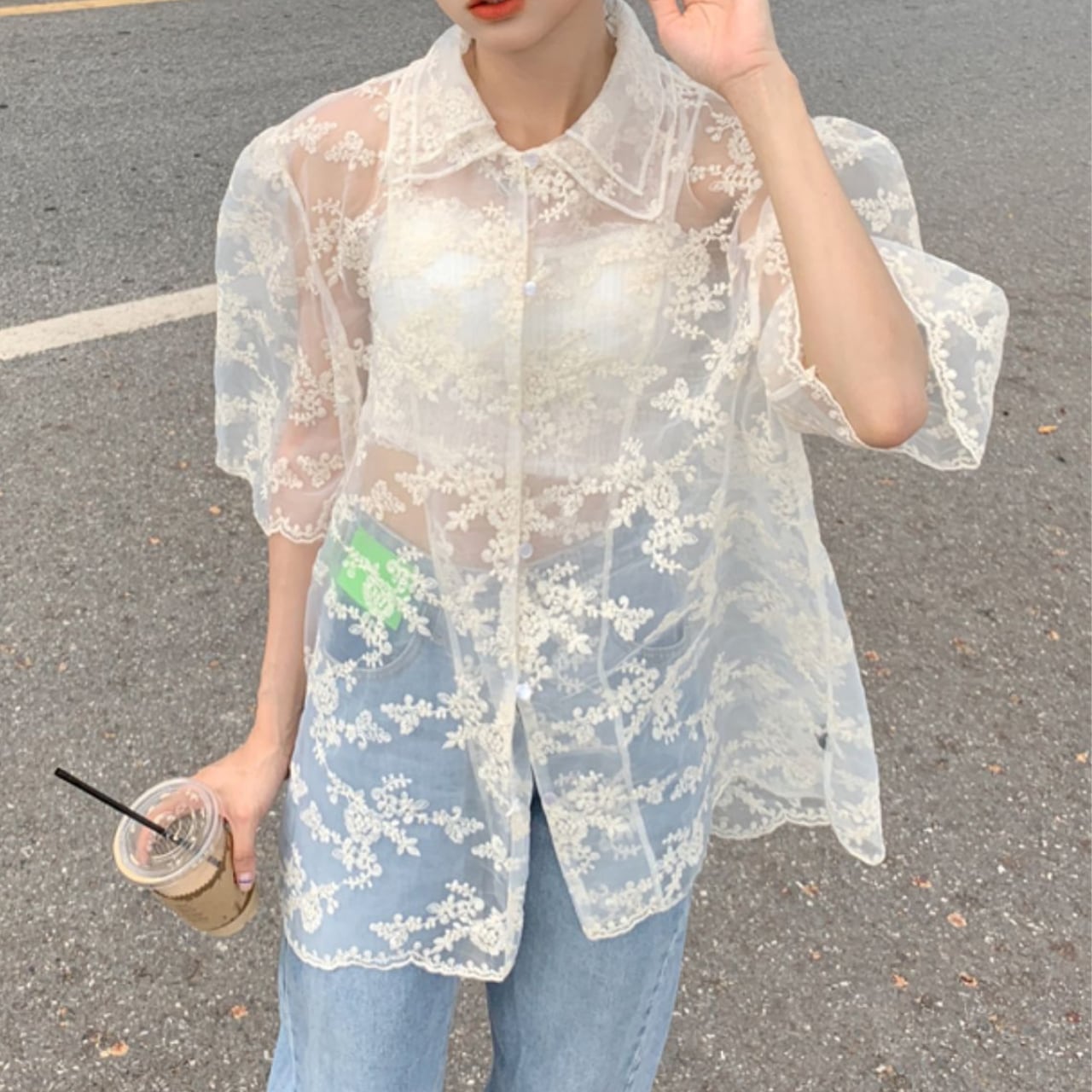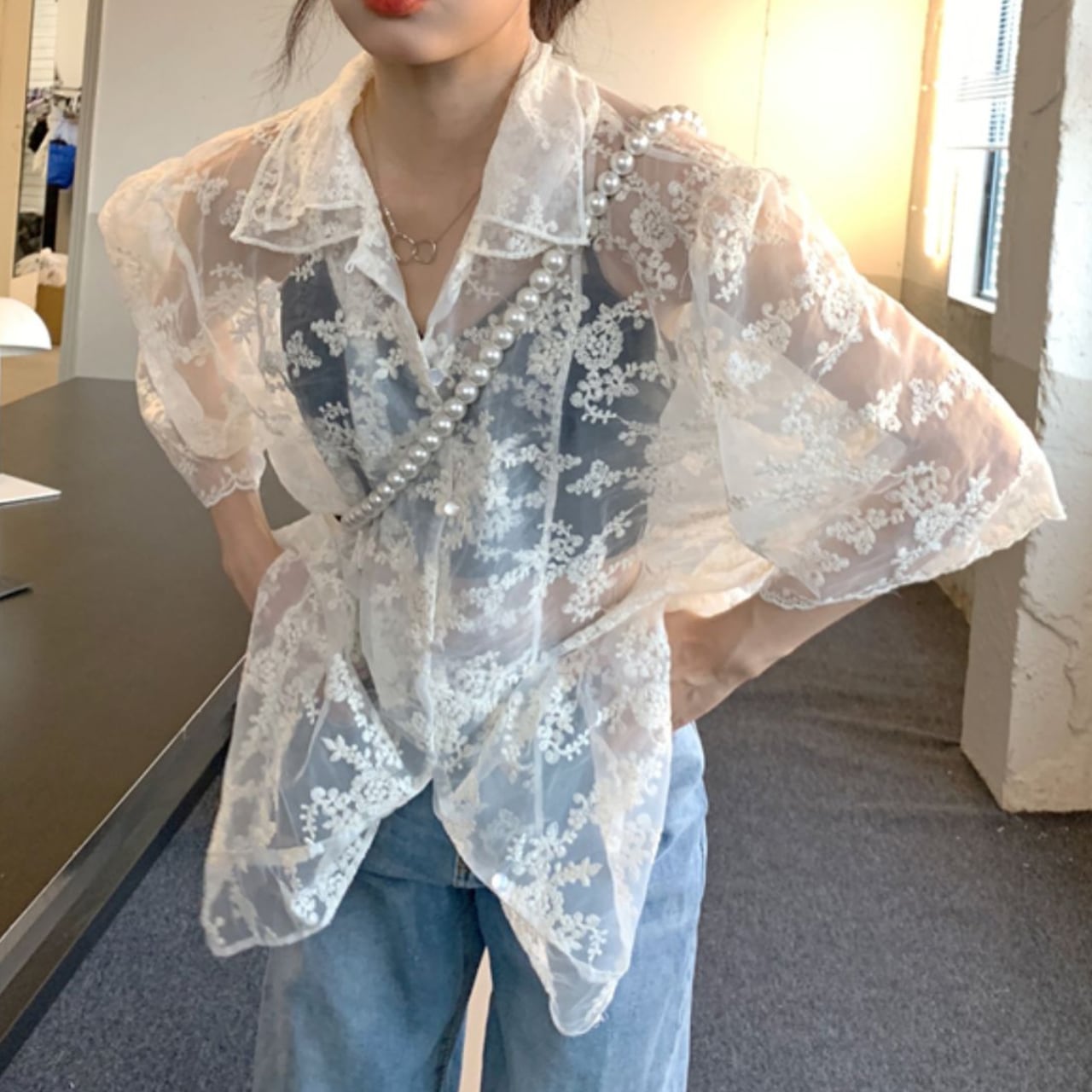 繊細な小花柄が踊るシアー素材のシャツ。光を透かす奥行きのある美しさと、ふんわりとしたシルエットが、着る人を儚げで上品な印象に導きます。