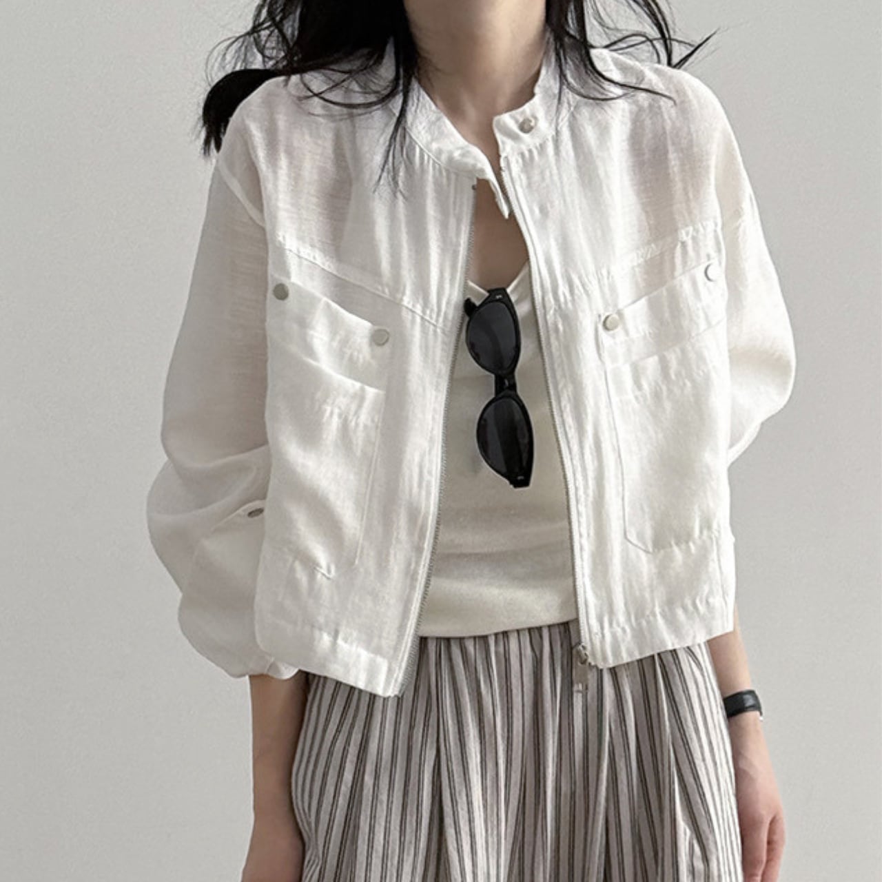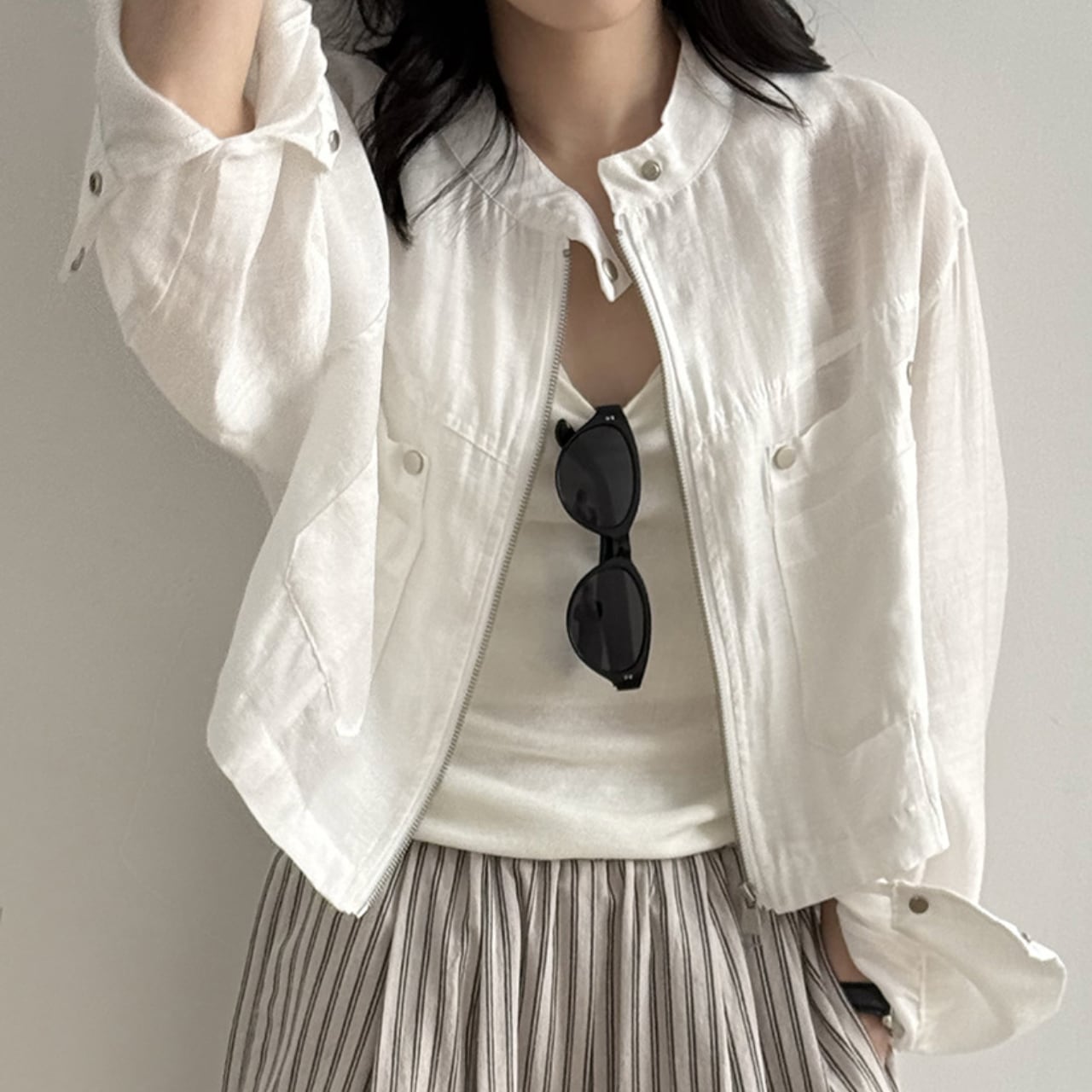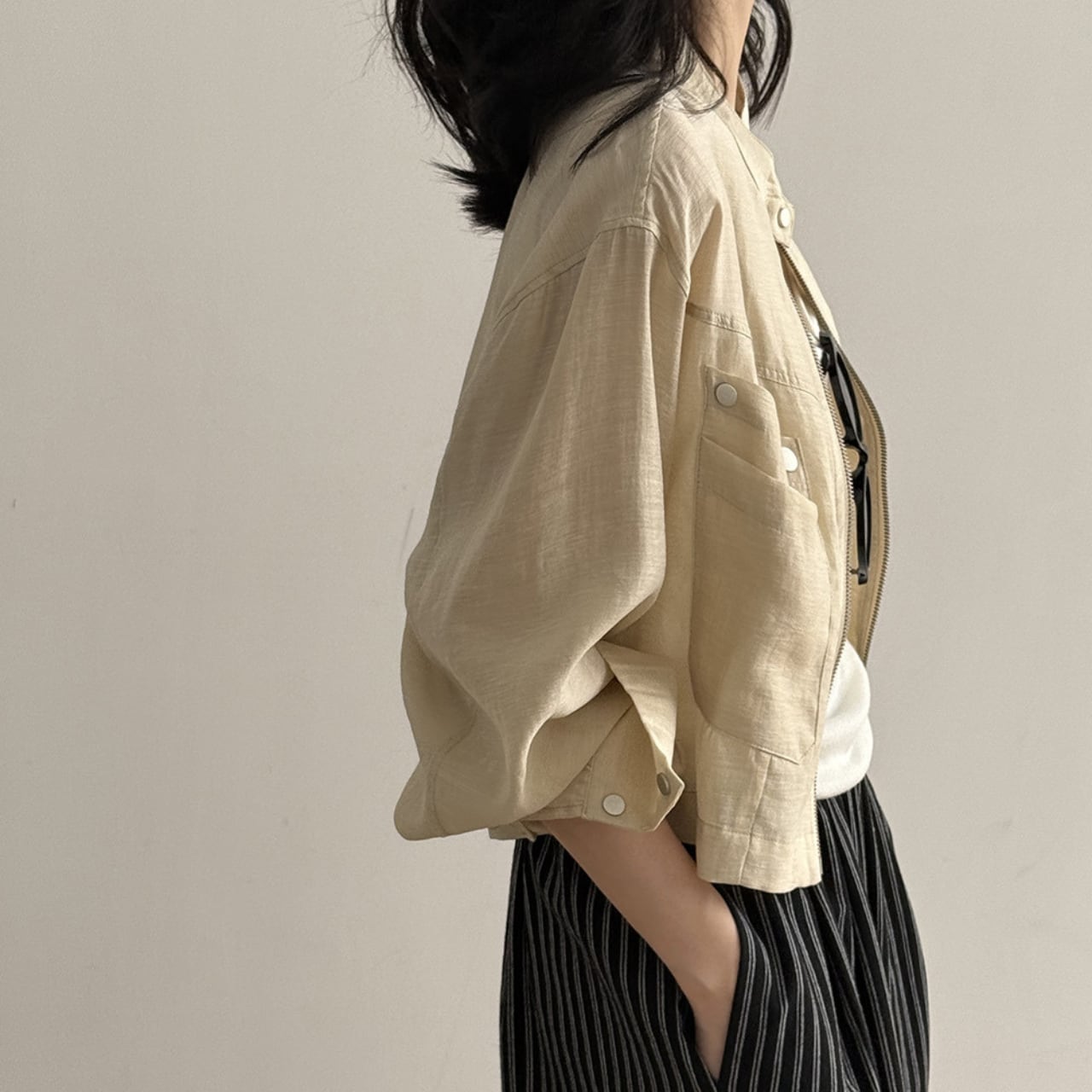 スタンドアップカラーが首元をスッキリと見せ、洗練された印象を演出します。