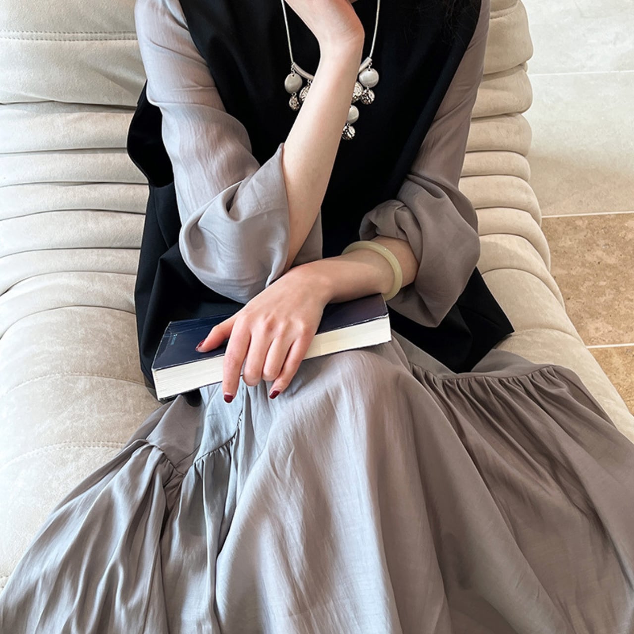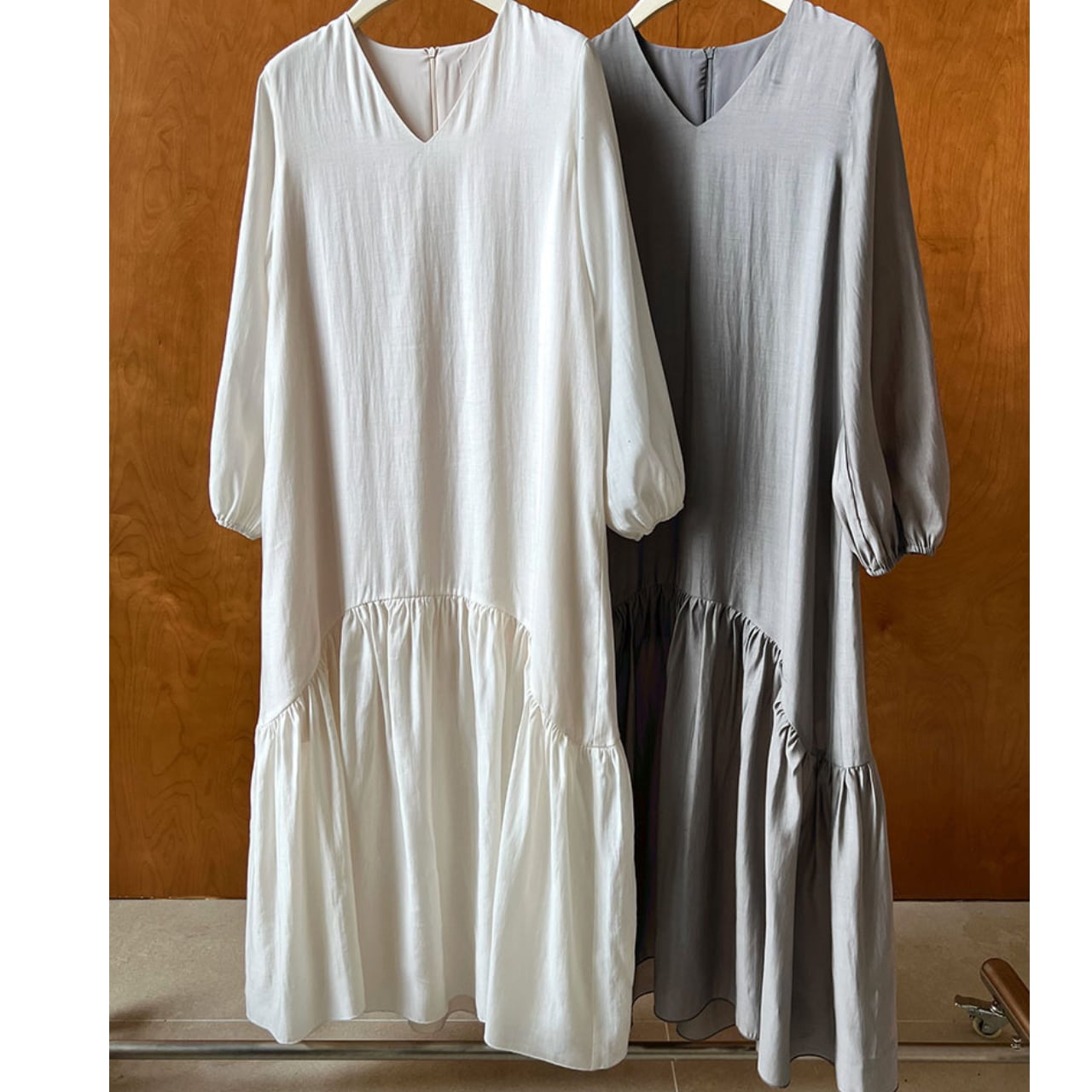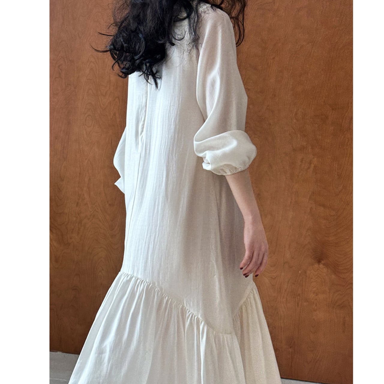 袖口のギャザーが上品なアクセントになり、裾のティアードデザインで動きのある美しさを作り出します。