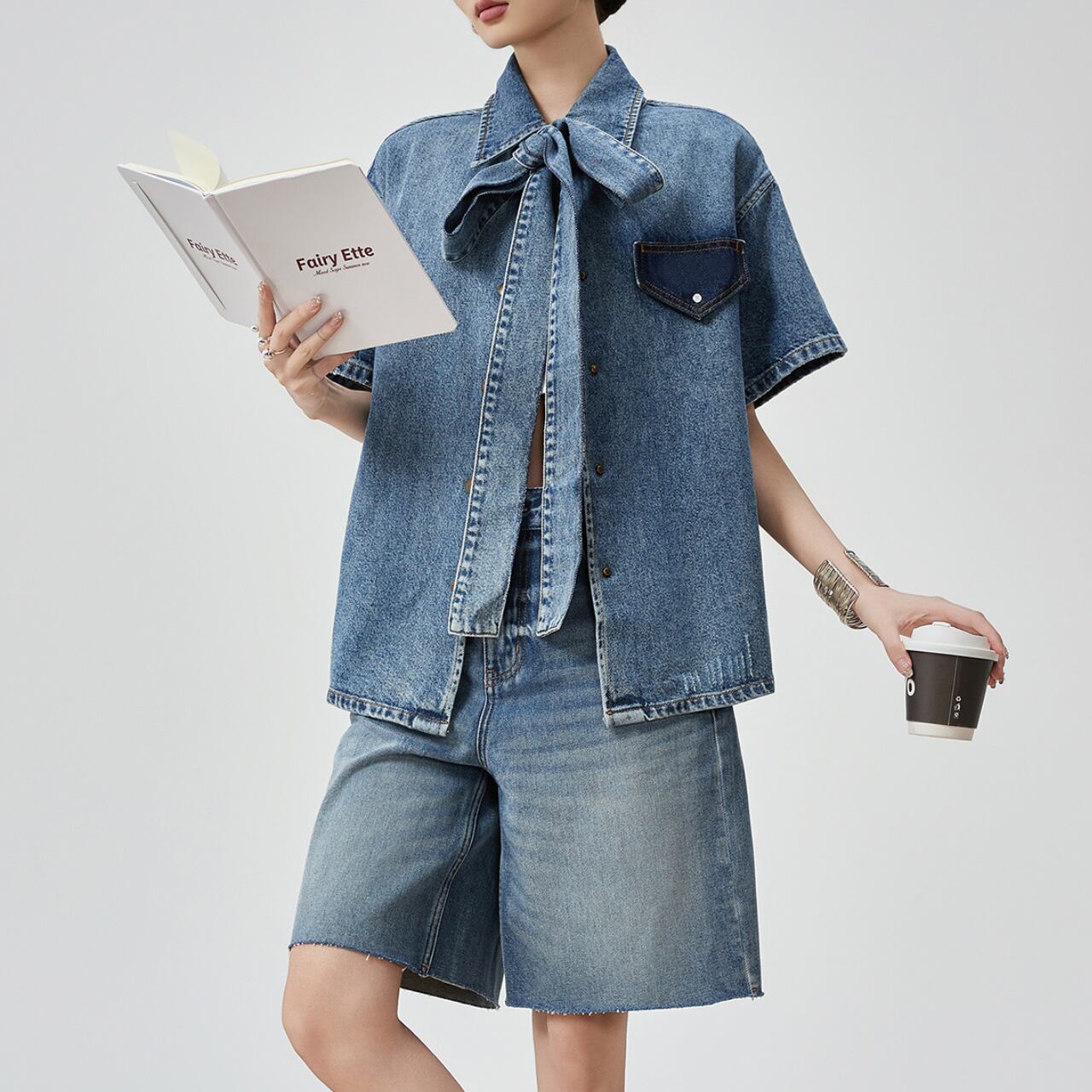 トラディショナルなボウタイディテールをデニム素材で表現した、新感覚のブラウス。
