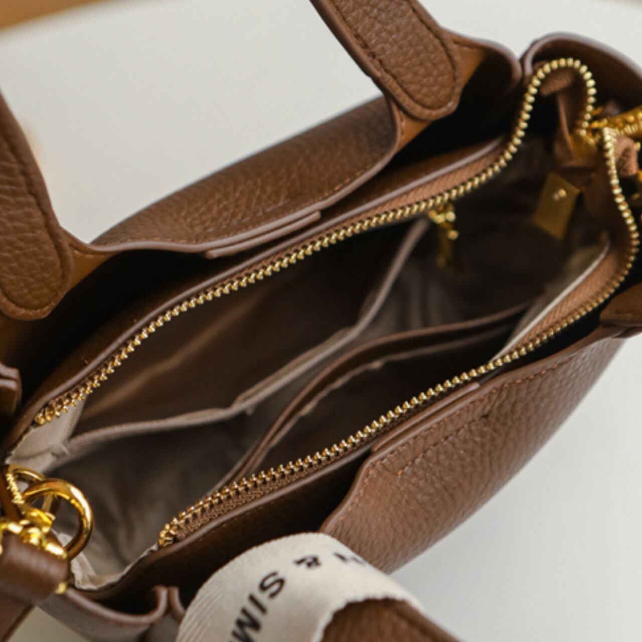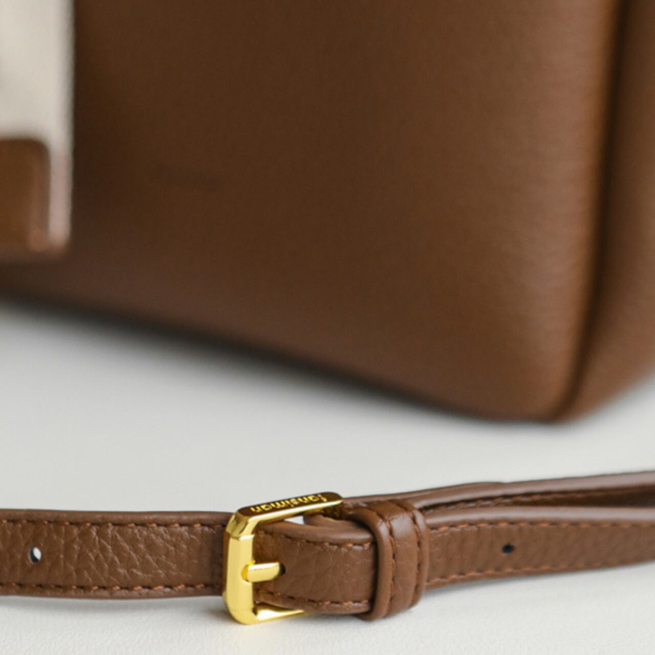 シンプルなロゴストラップがアクセントを加え、ゴールド調の金具が上品さをプラスします。