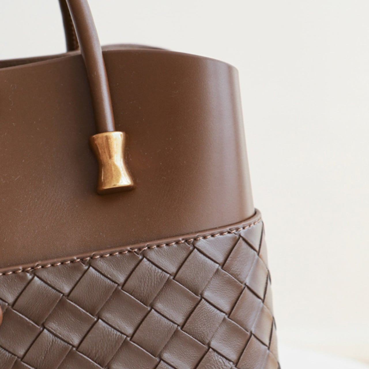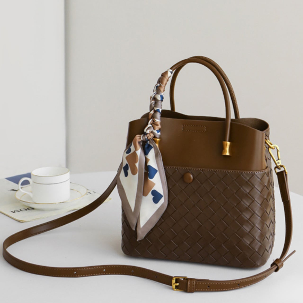 クラフト感あふれる編み込みがデザインと優雅なスカーフがアクセントとなり、上品さを演出します。
