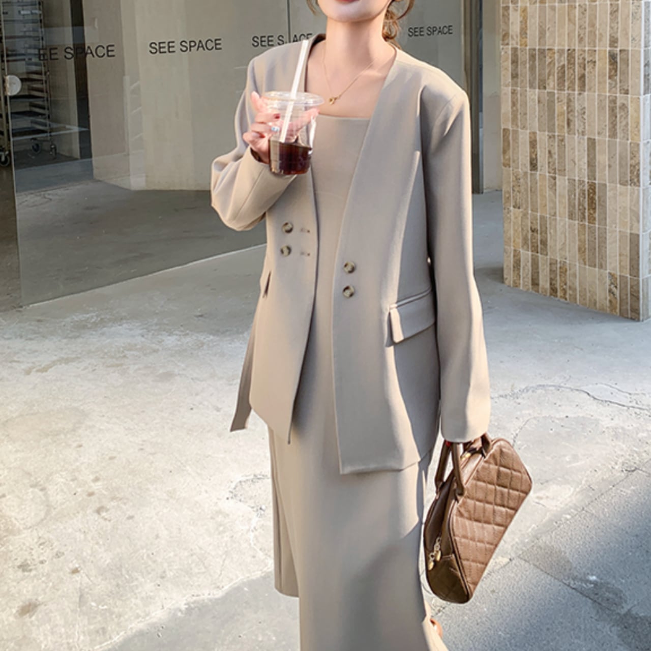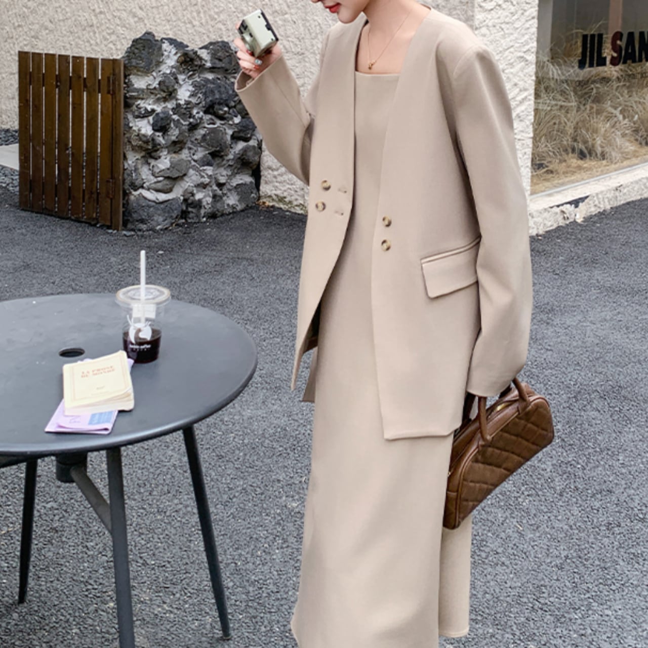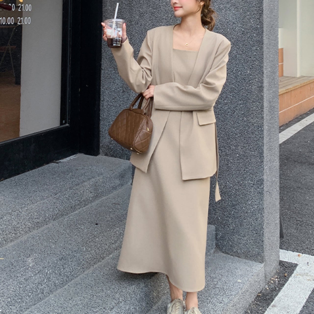 ノーカラージャケット&サスペンダーのワンピースセット。