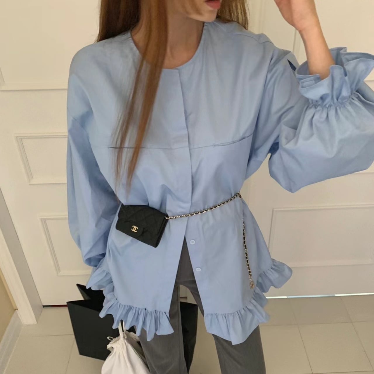 袖口と裾に施されたエレガントなフリルディテールが魅力のシャツ。