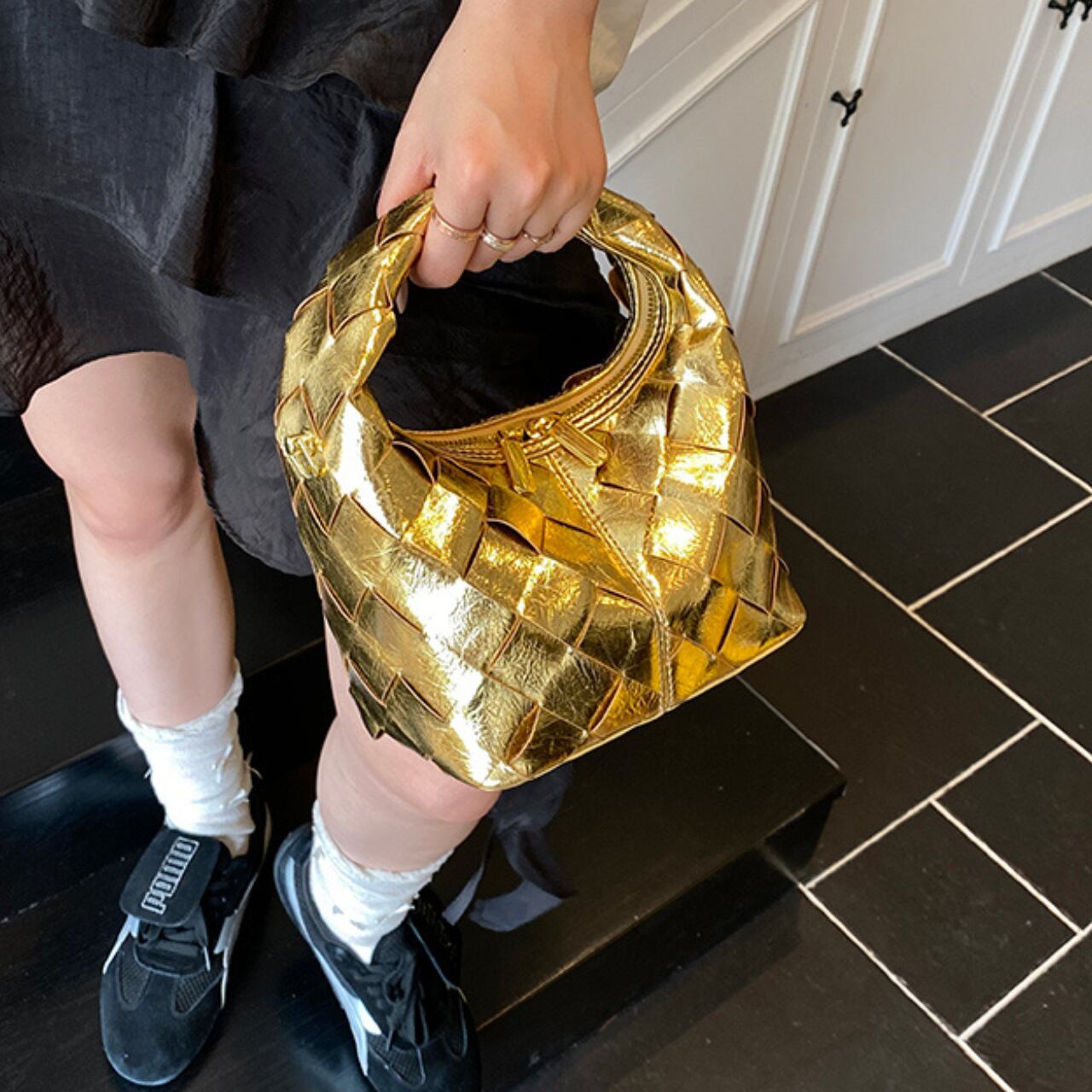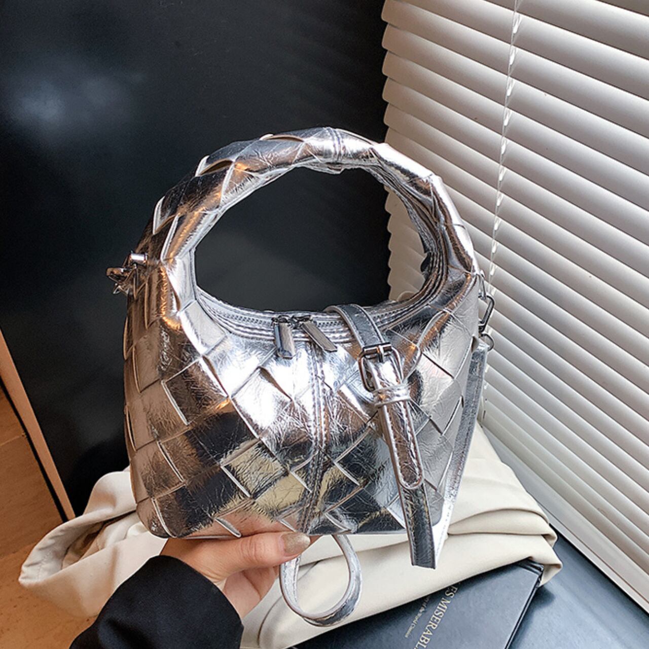 まるで現代アートのような美しい編み込みデザインが印象的で光沢感が洗練された都会的な魅力を演出。アーティスティックなフォルムが特徴的な逸品です。