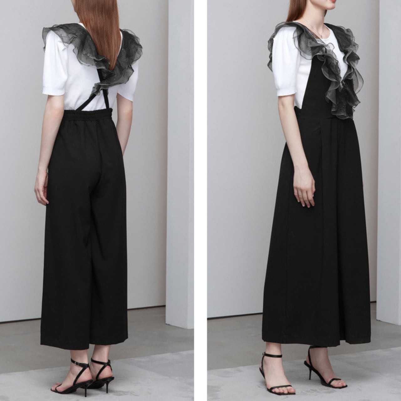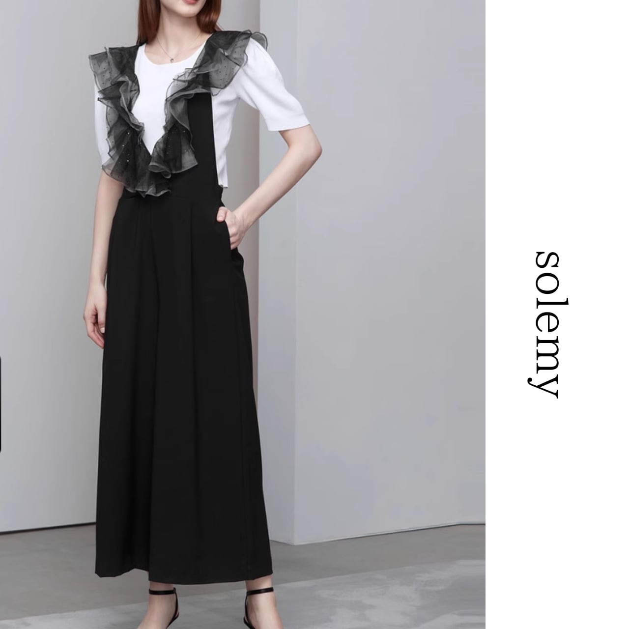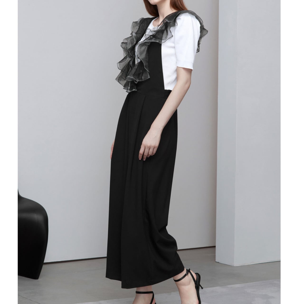 胸元を華やかに彩る立体的なフリルがコーディネートのアクセントに。