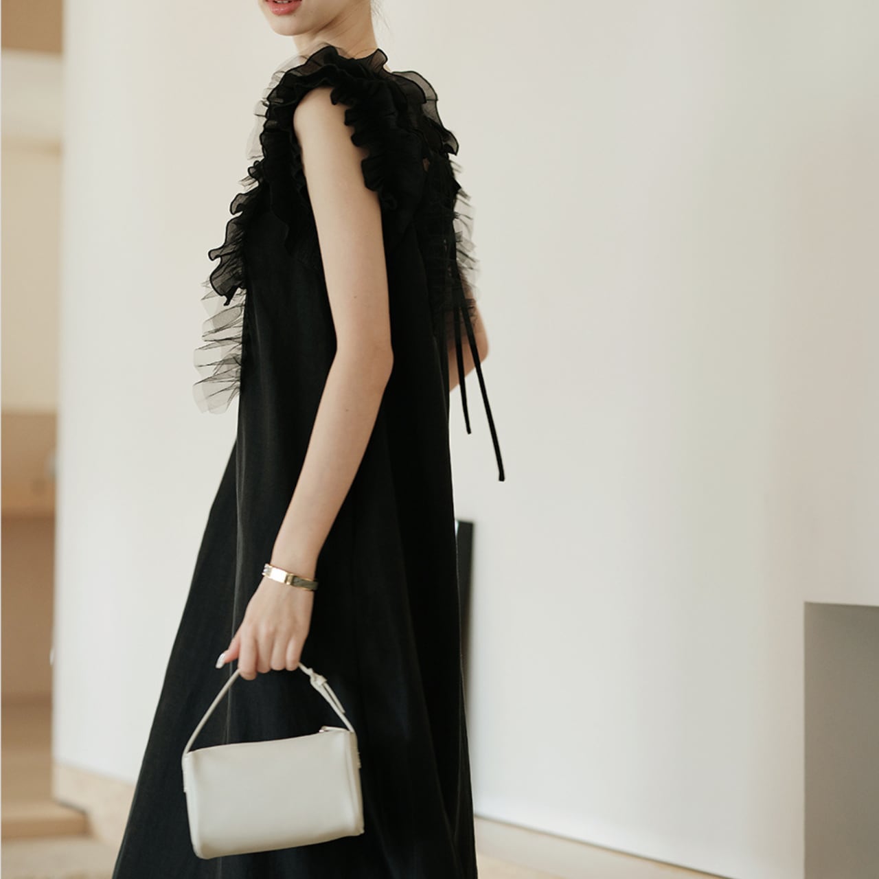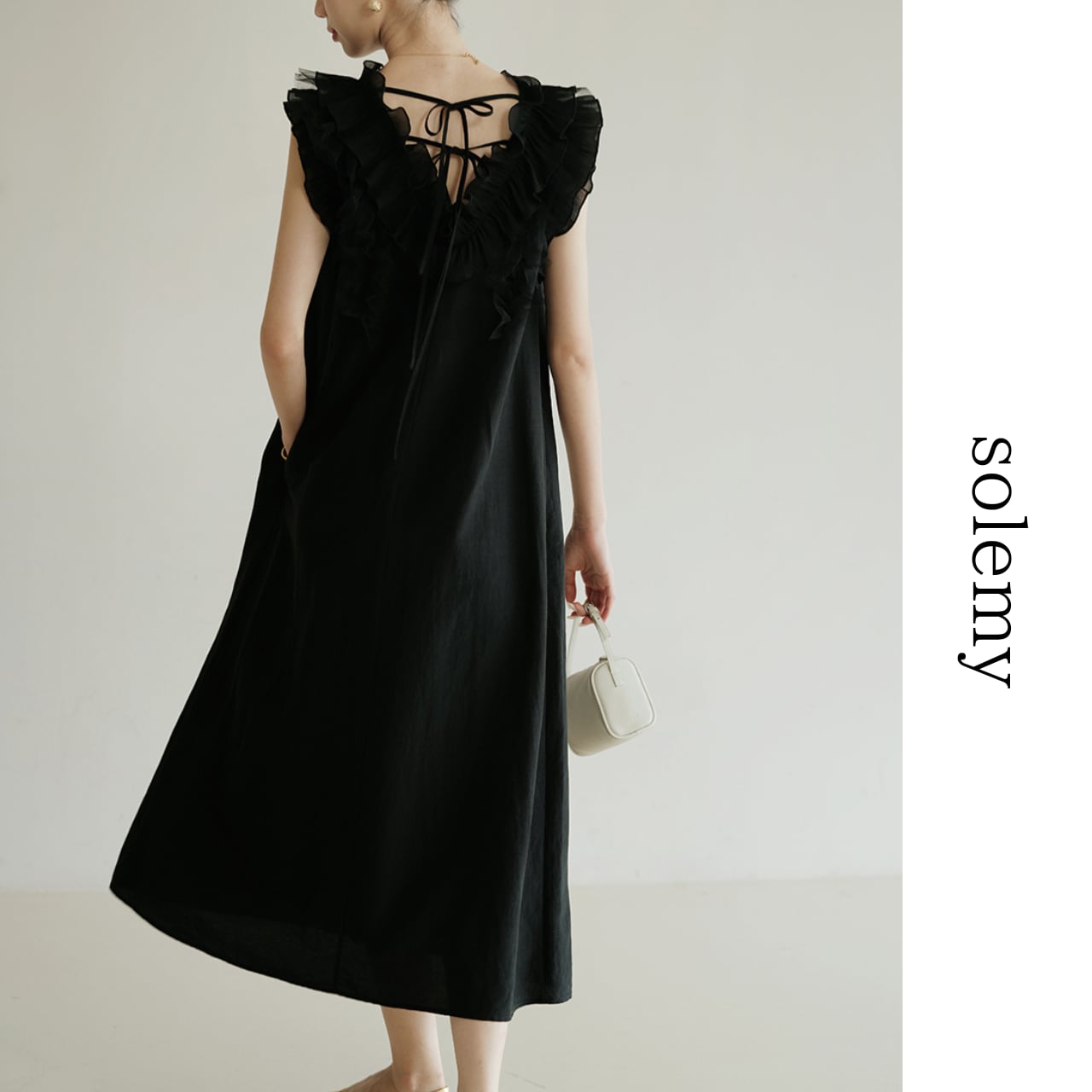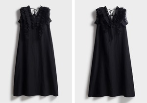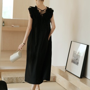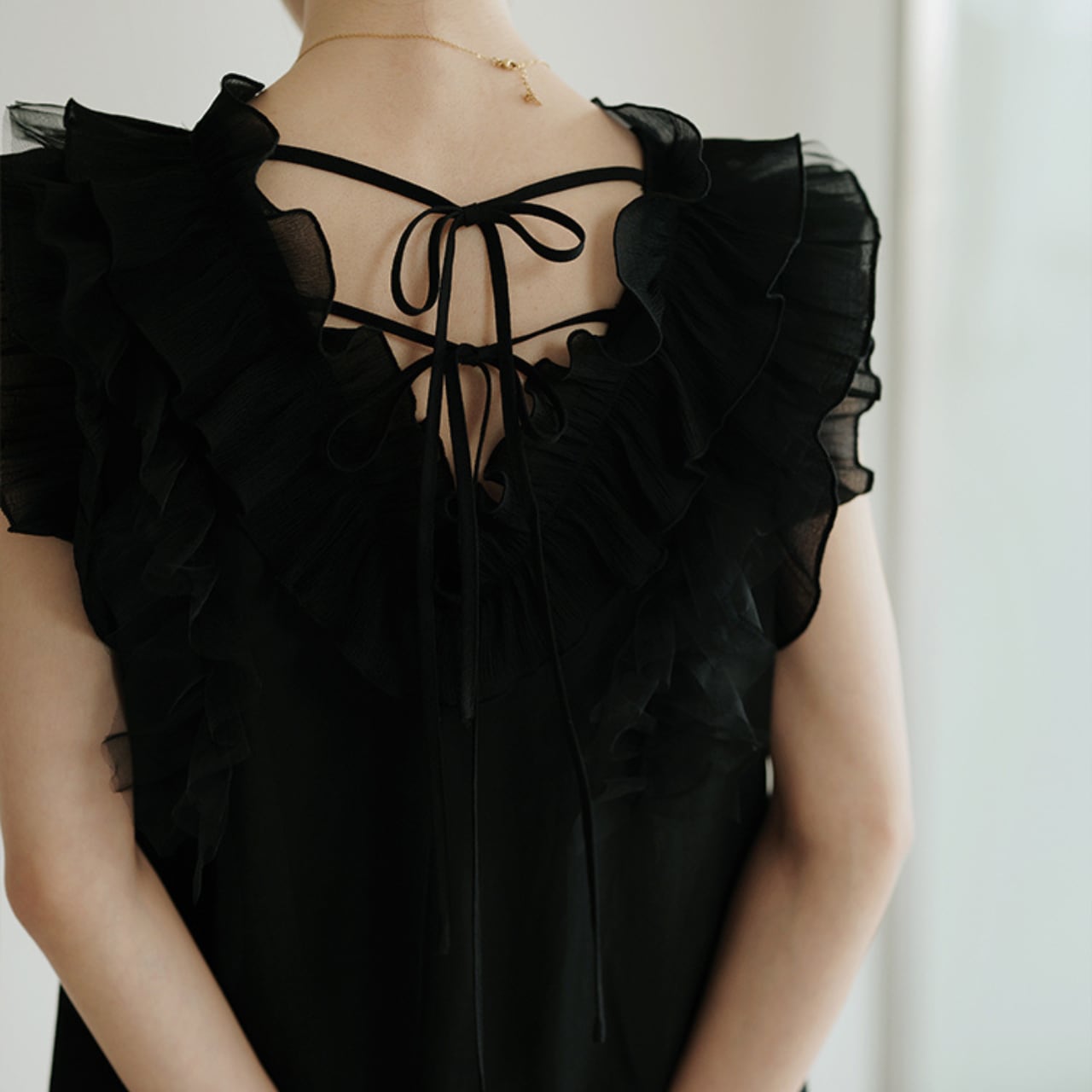 繊細なチュールフリルと美しいバックデザインが印象的な、上品で女性らしいワンピース。