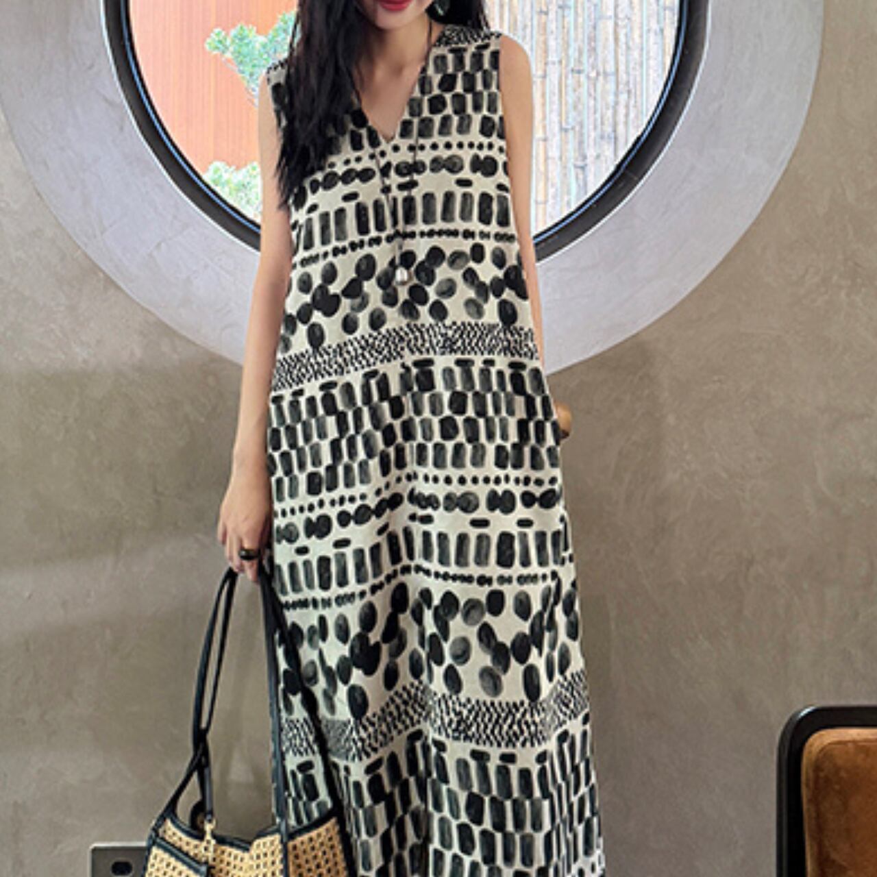 ジオメトリックパターンが際立つ、アーティスティックなワンピース。
