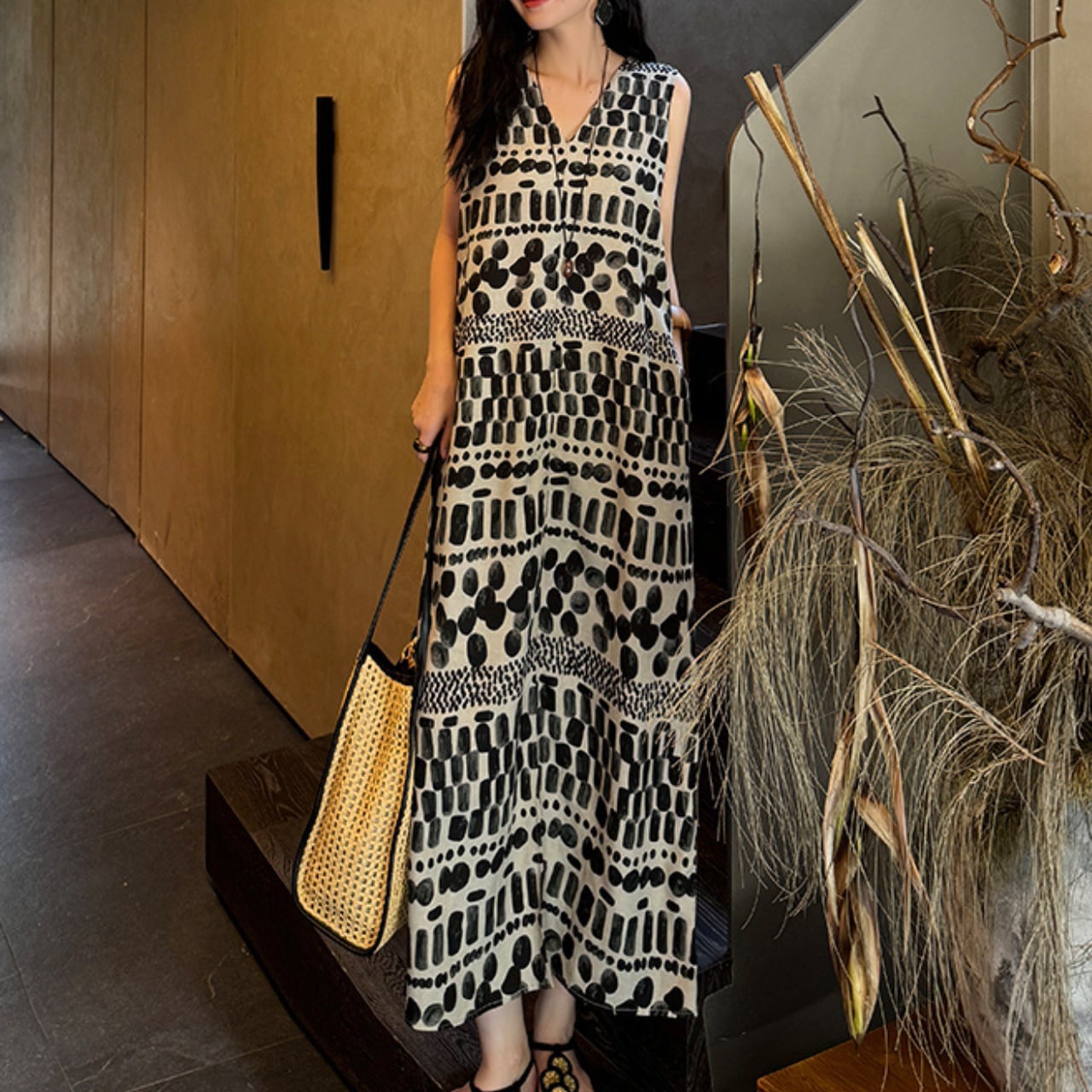 深めのVネックで首元をすっきりと美しく見せ、ノースリーブデザインが爽やかな印象を与えます。
