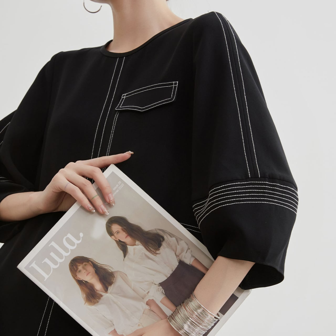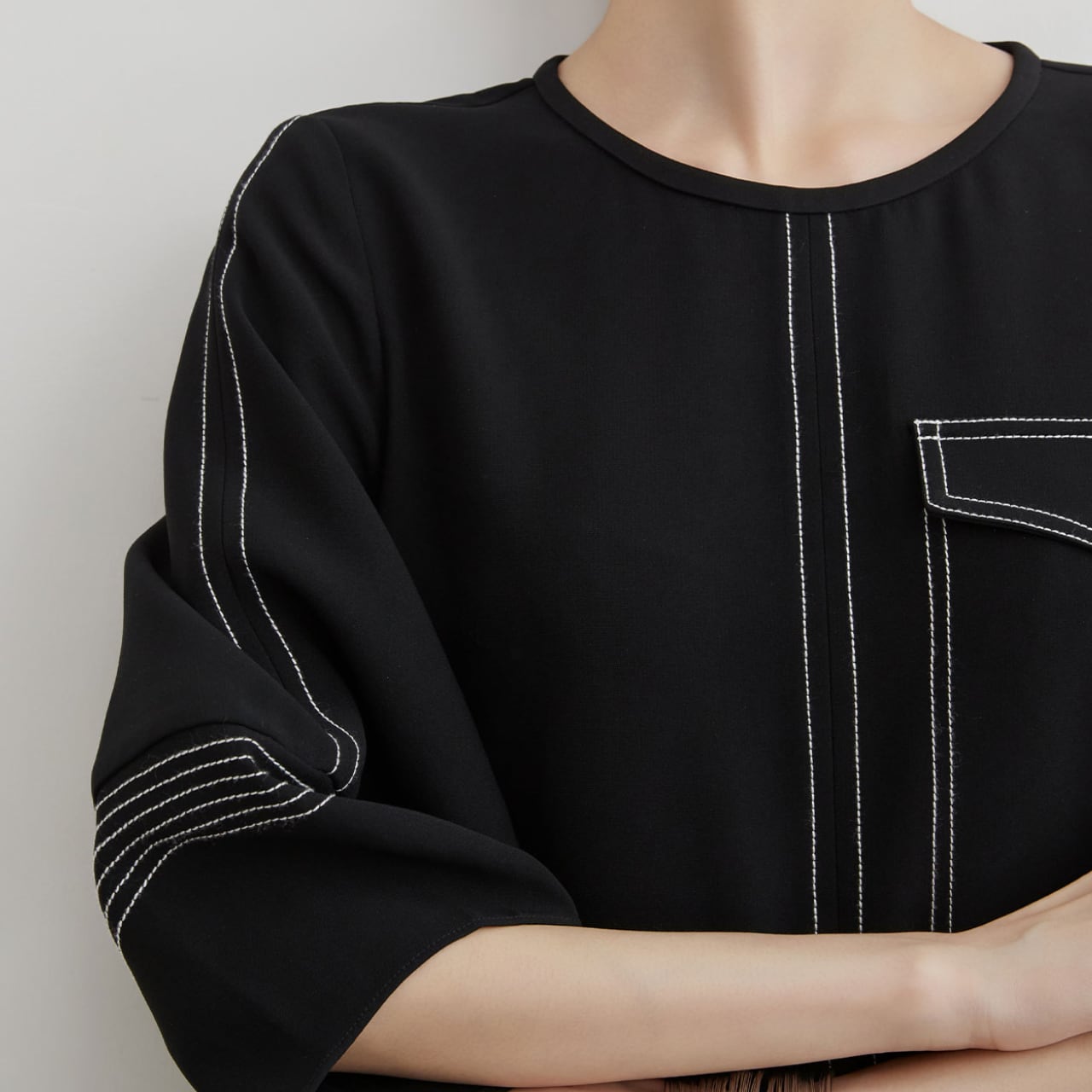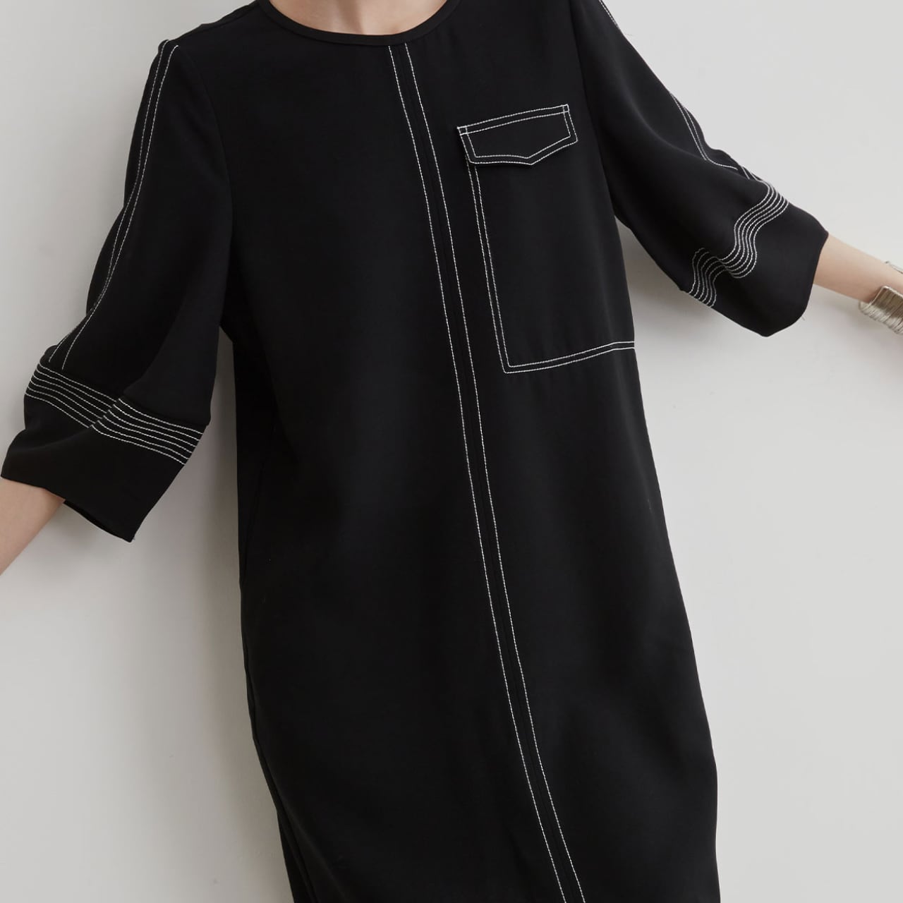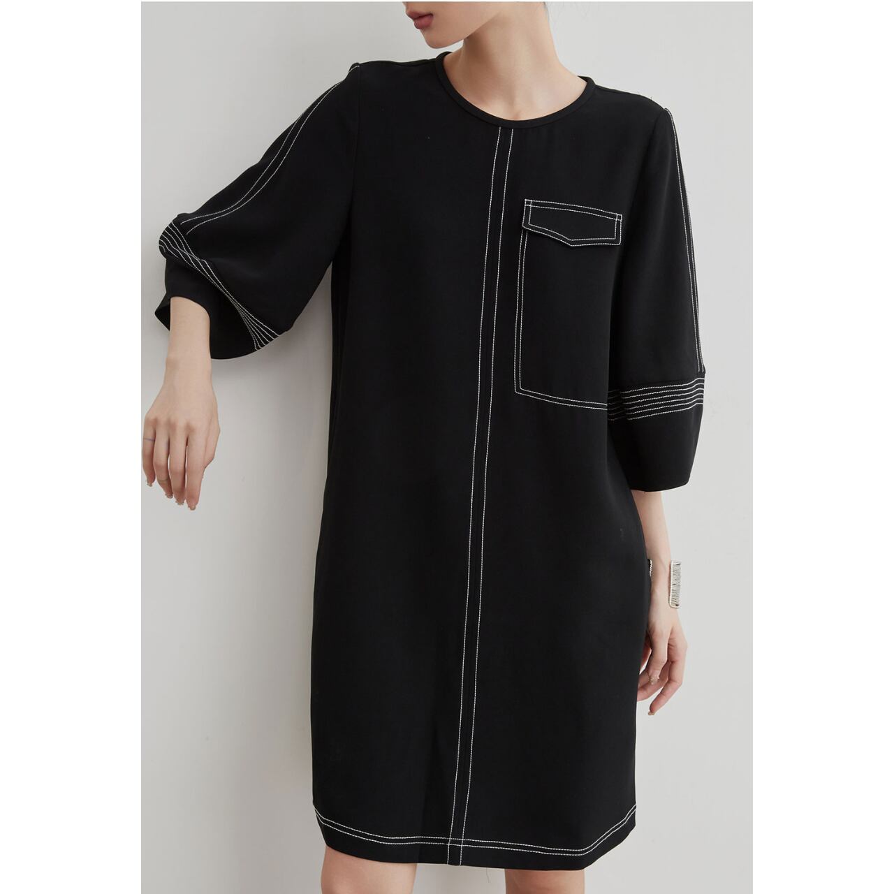 ブラックベースに映える白のコントラストステッチが、シンプルながらもモダンで洗練された印象を演出するワンピース。
