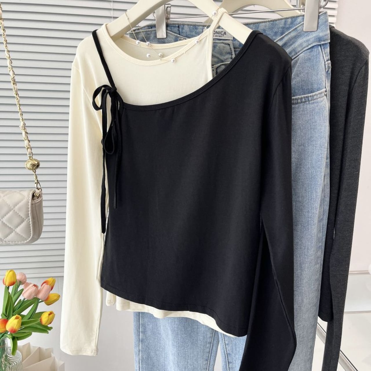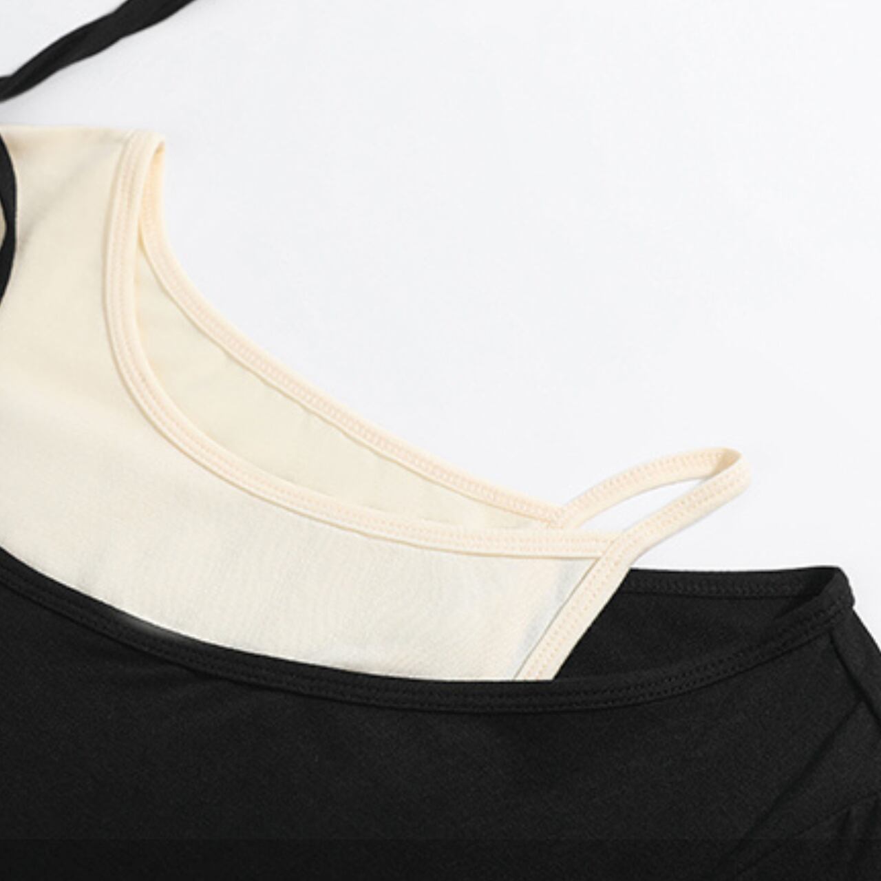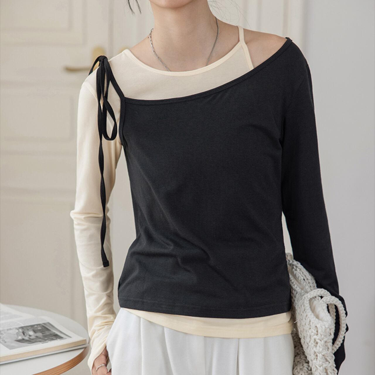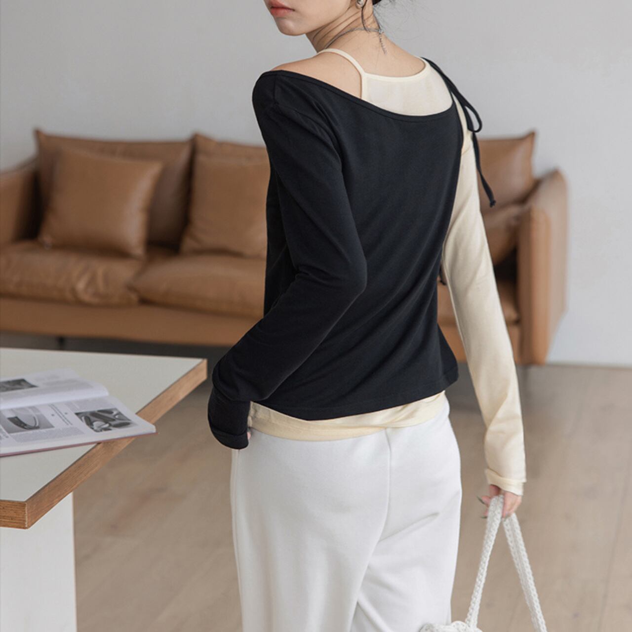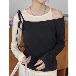 2つの異なるカラーが重なり合ったレースアップシャツ。