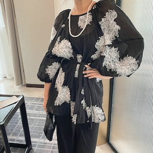 ルーズなウエストシルエットが体型を包み込み、リラックス感とエレガンスを両立したアイテムです。