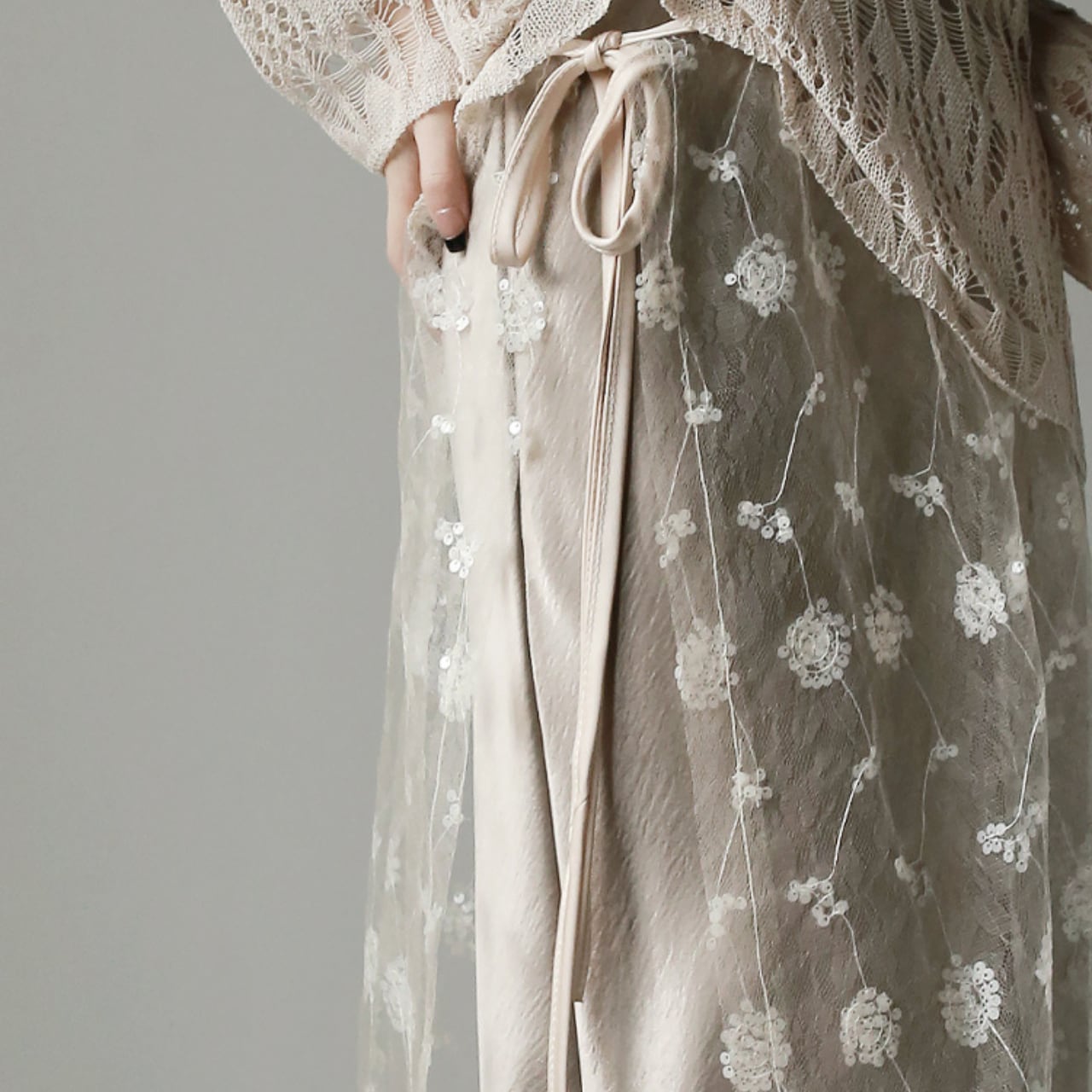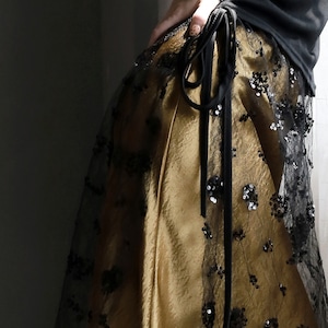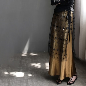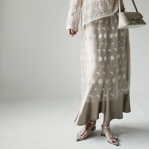 メッシュとサテンの美しいコンビネーションが、特別な瞬間を演出するレイヤードスカート。
