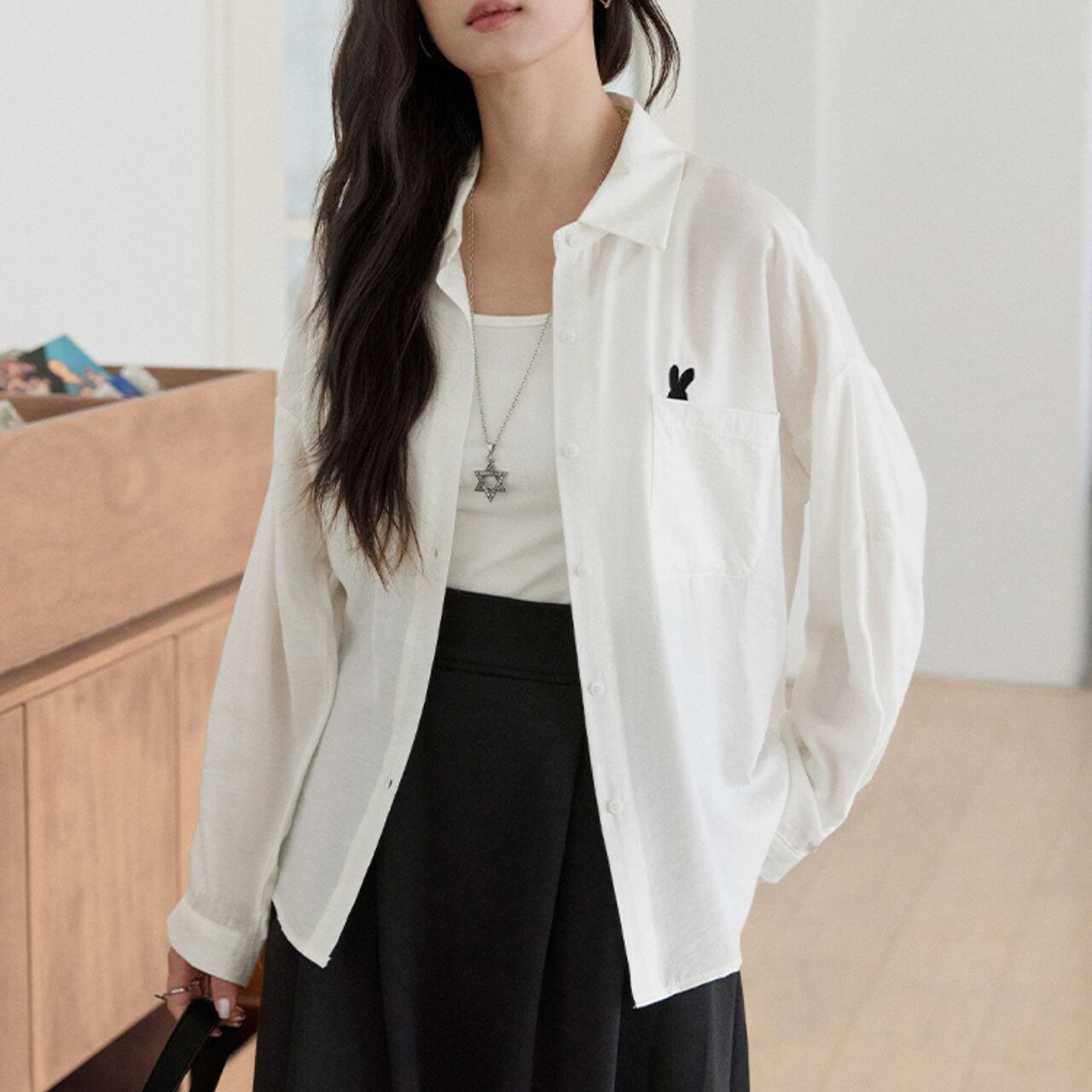 シンプルなデザインながらも、胸元の刺繍デザインがアクセントになったホワイトシャツ。