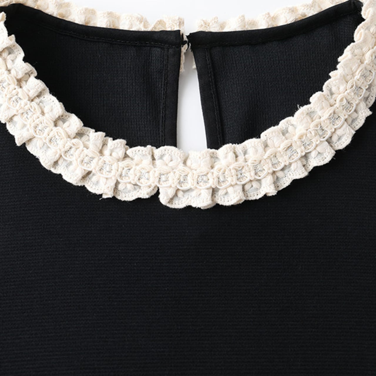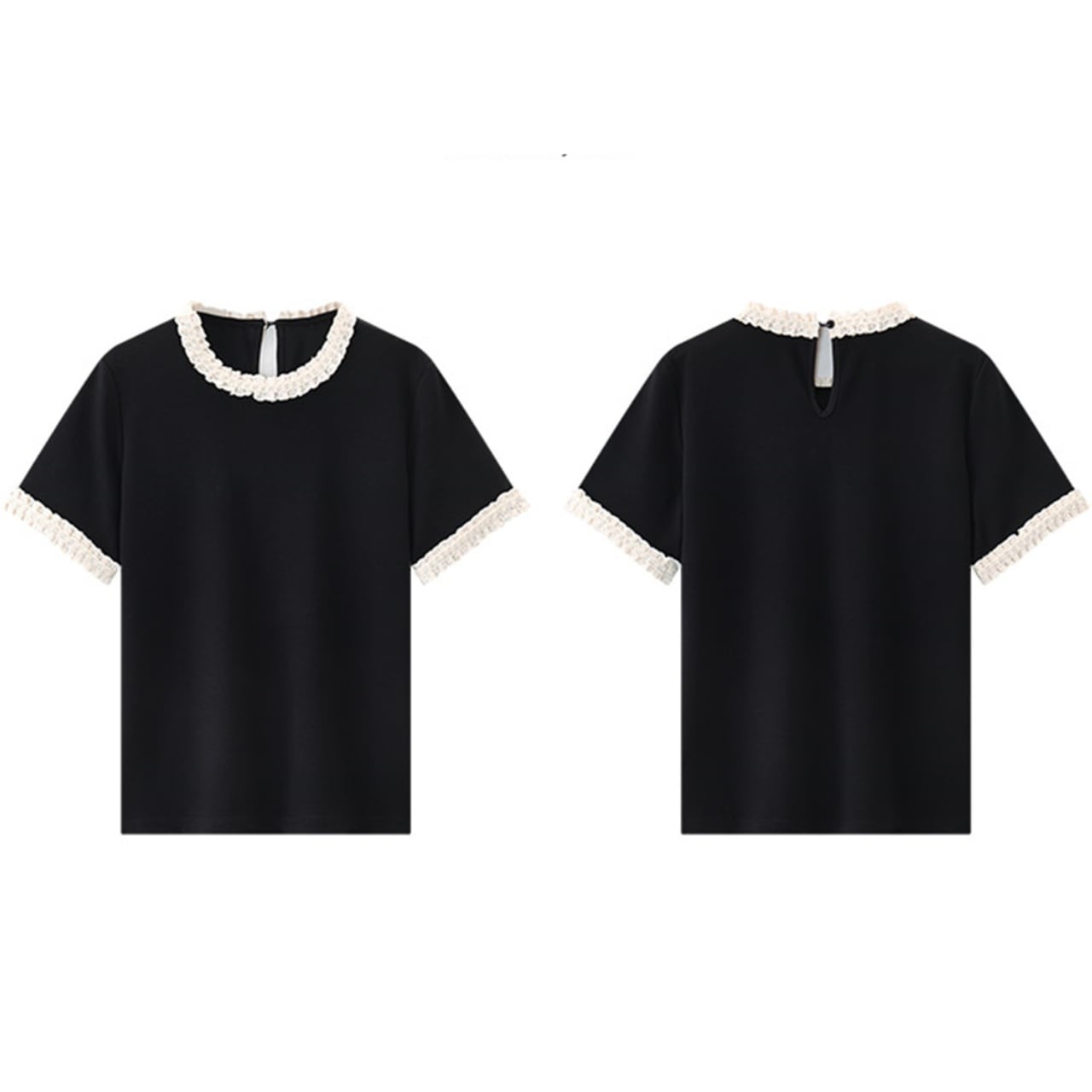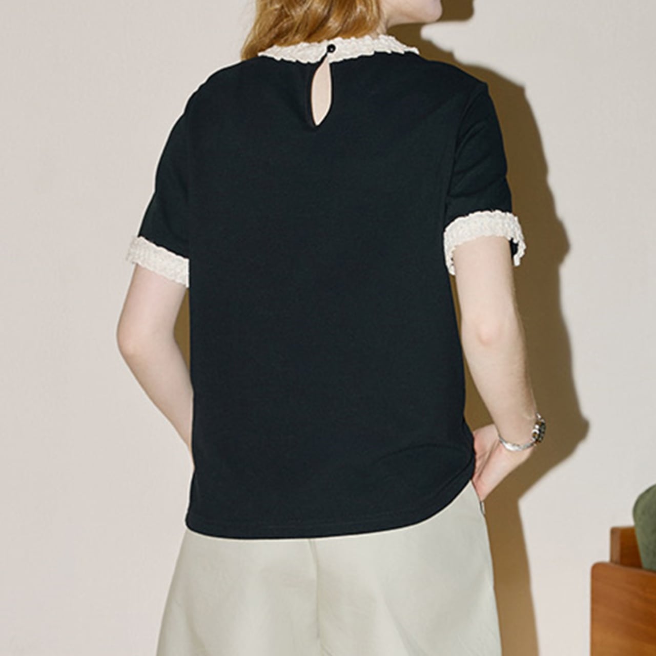 襟元と袖口を彩る上品なレースがオシャレなトップス。シンプルなシルエットにエレガンスをプラスします。