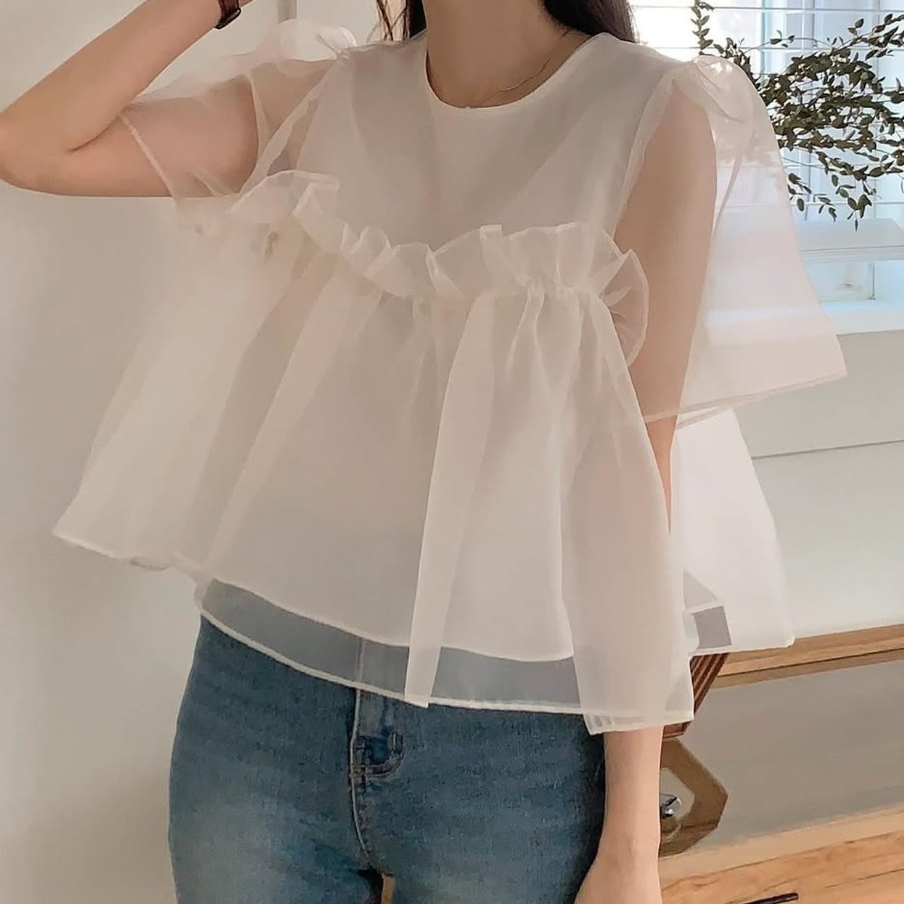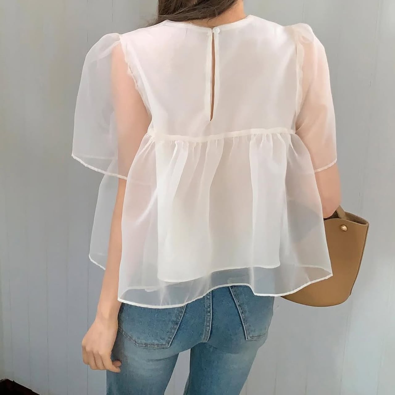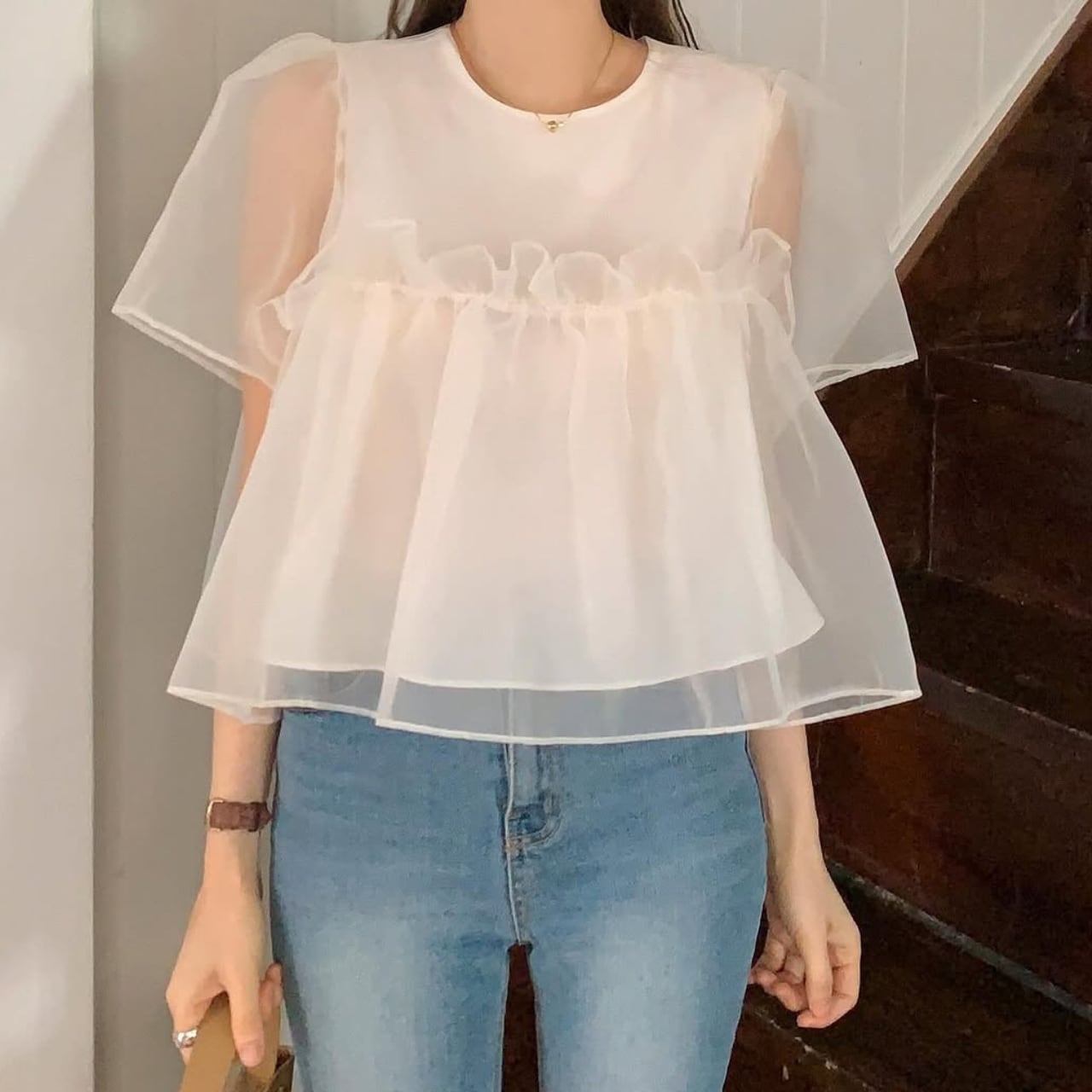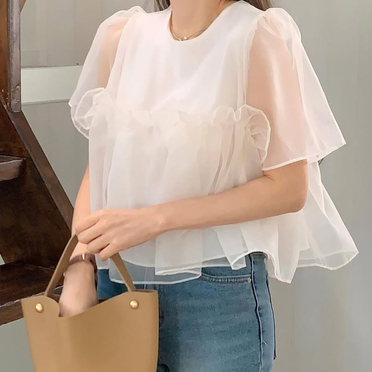 繊細なシアー素材と美しいティアードデザインが魅力のブラウス。