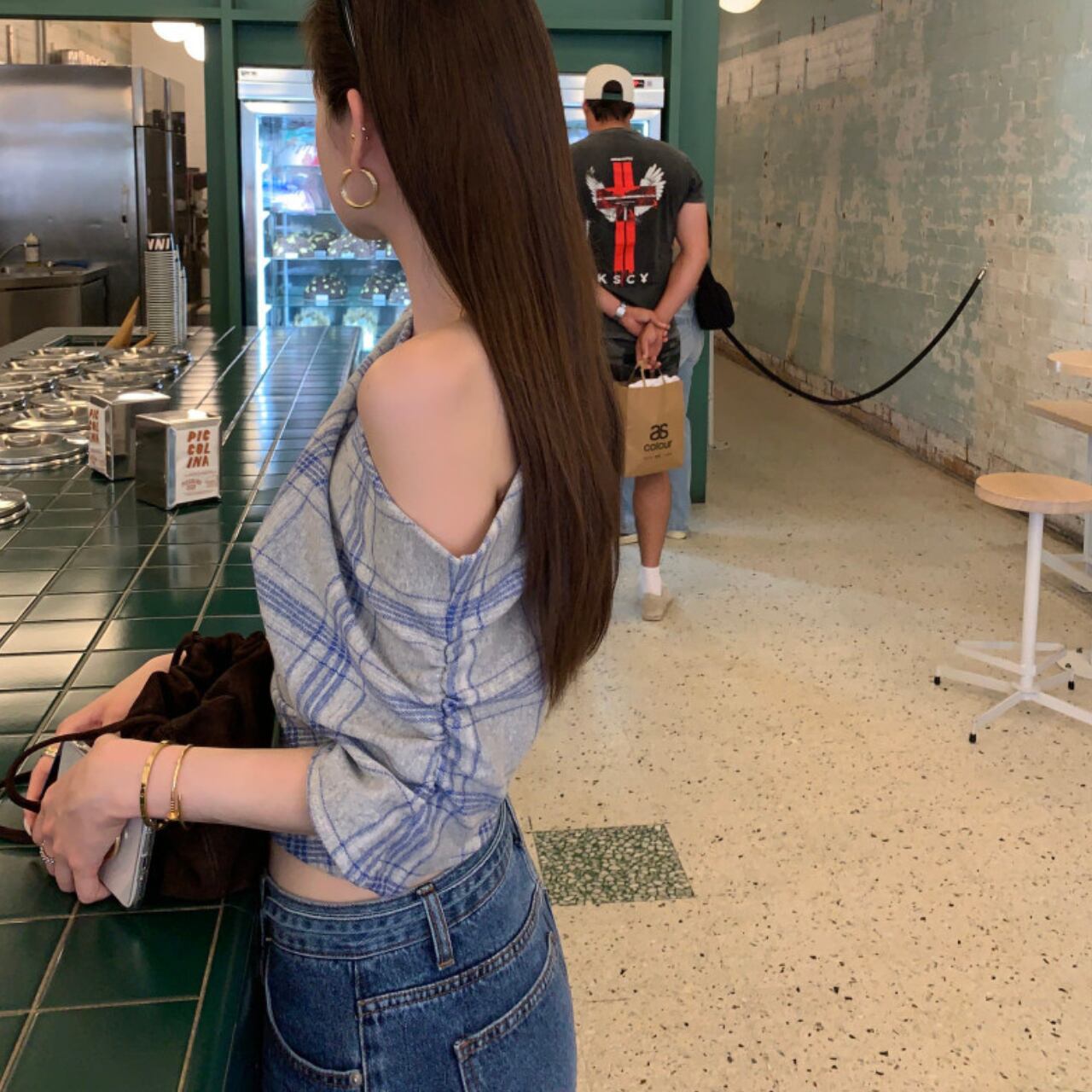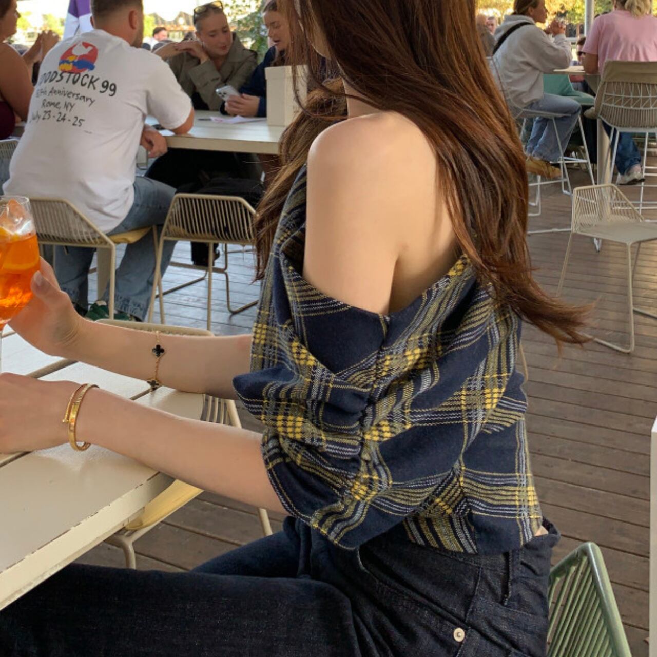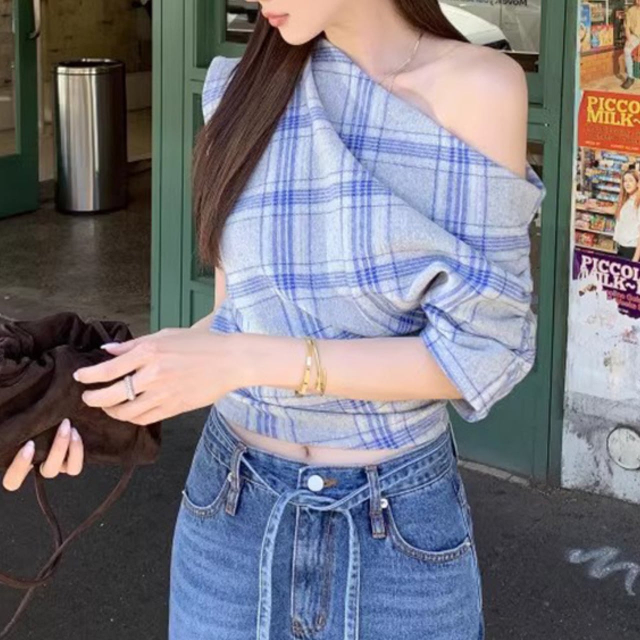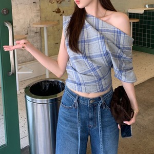 Off-the-shoulder check top in 2 colors S1572