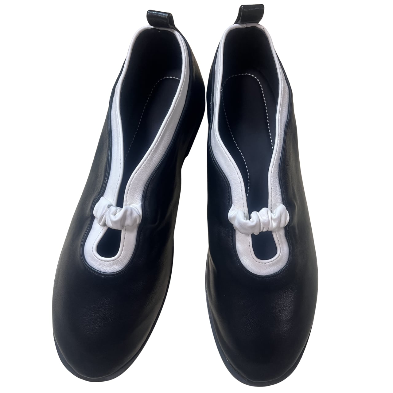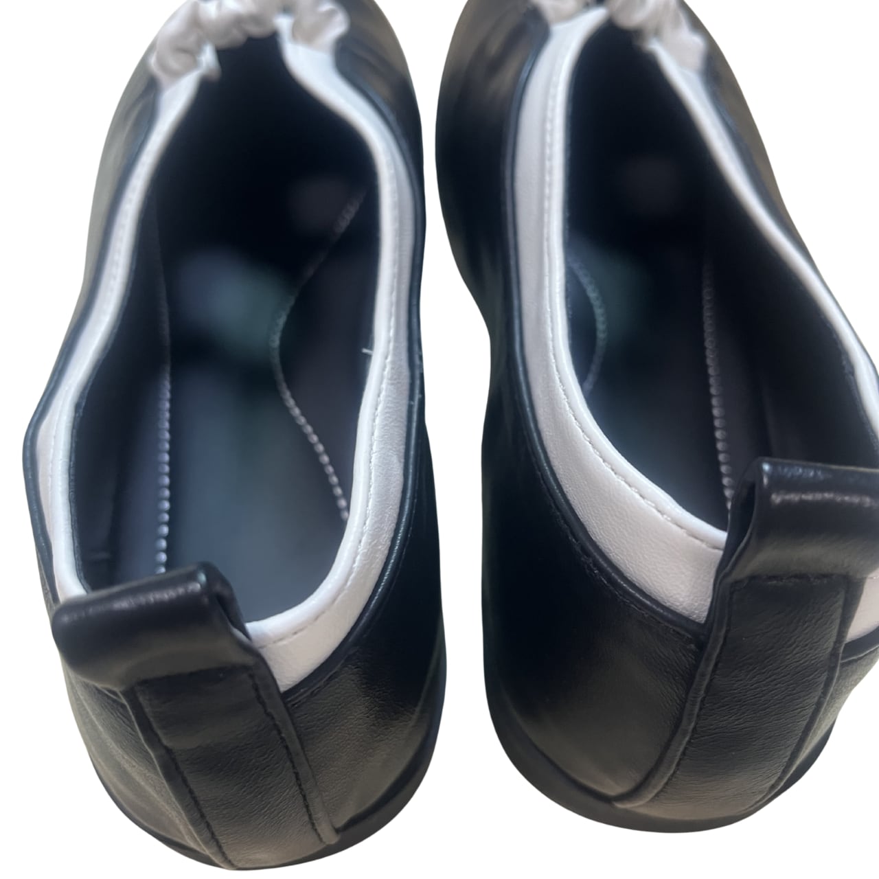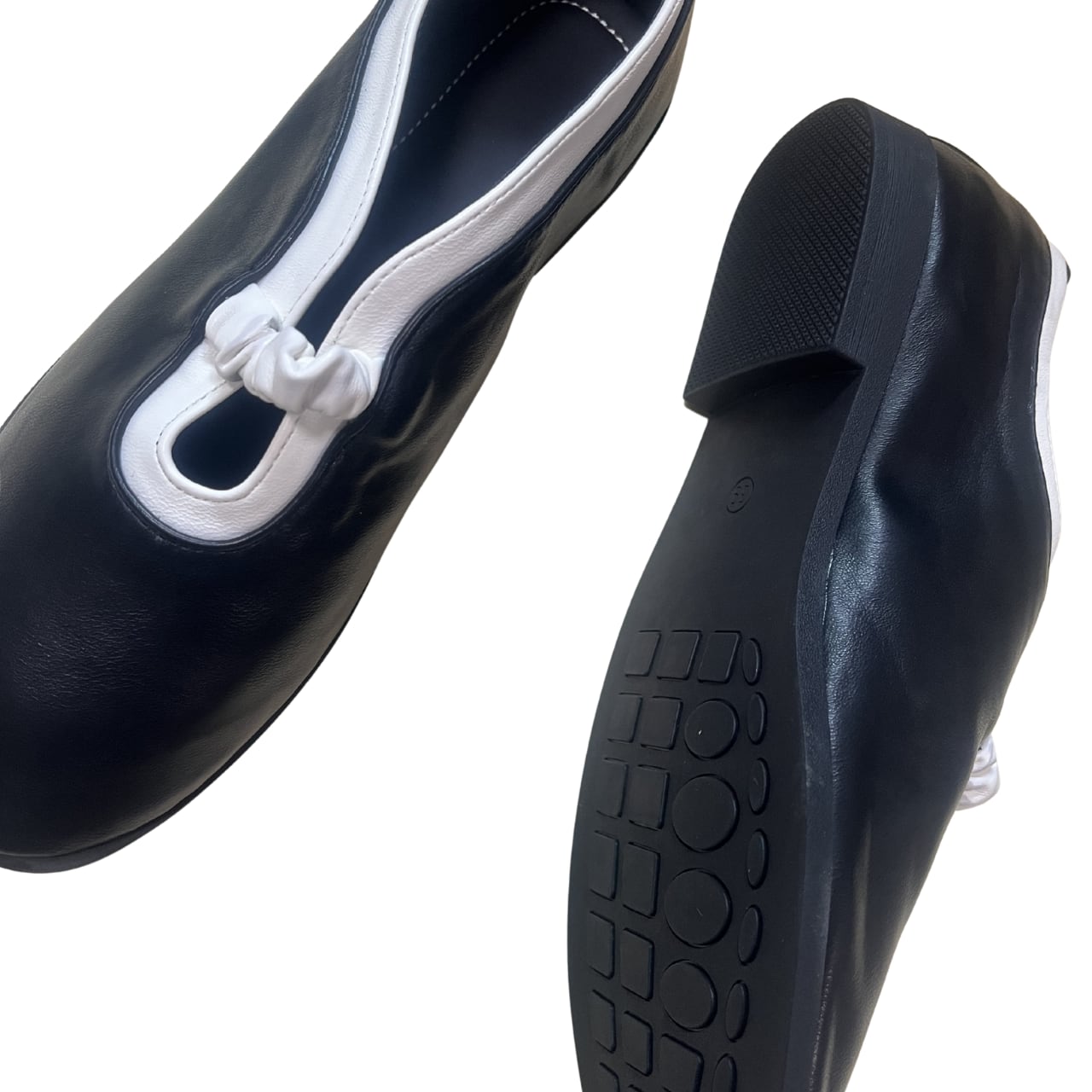 クラシックなブラックベースに映えるホワイトのコントラストが、足元に洗練されたアクセントをプラス。モノトーンの美しさが際立つ、計算されたカラーバランスです。